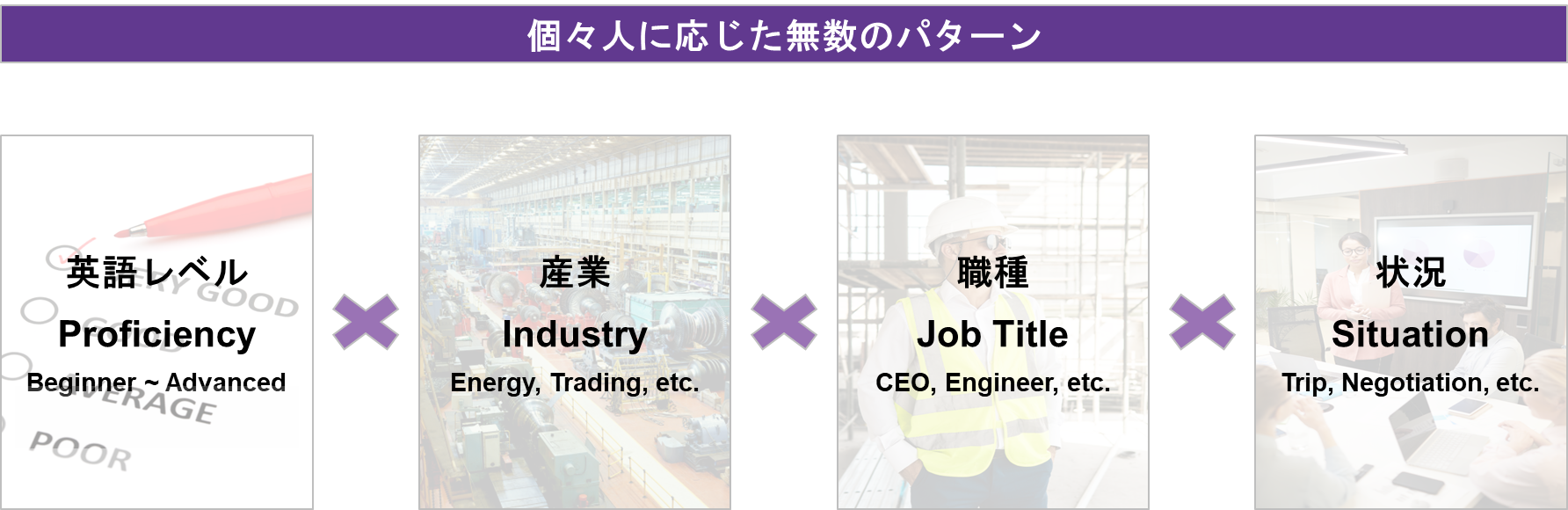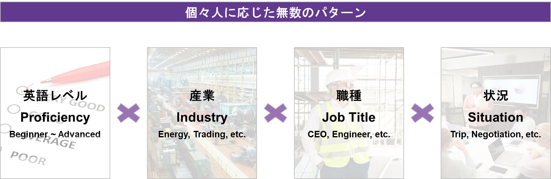 社会人が「英語を勉強しよう」と思い立つきっかけでは①仕事で必要になった、②将来のキャリアップのためといった理由が約半数を占めると言われています。一方で、ビジネス上の英語利用シーンは、必要な語彙も英語表現も業界・職種・状況の組み合わせにより無数のパターンが存在しています。そのため、最短距離で【現場で使える】英語力を身に着ける為には、「何を学ぶべきか分からない」、「教材が自分に合っていない」という課題を乗り越える必要がありました。