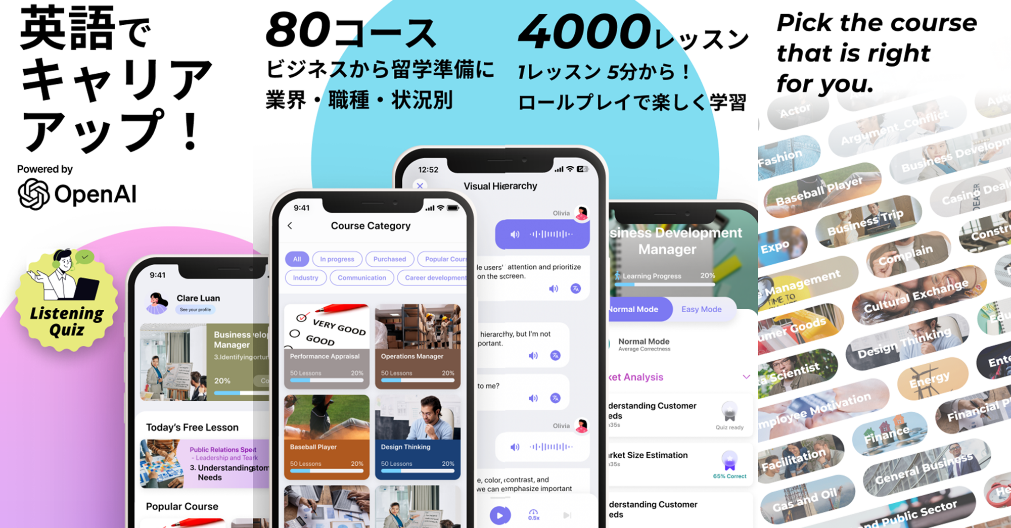 今回、Loop EnglishはLLM技術(ChatGPT API)と独自のAIを組み合わせることで職種・業界・状況別のビジネス英語コースを開発致しました。一人一人のビジネスにとって必要な英語力に絞り、リスニング・スピーキング・単語力の向上を支援します。先行展開を行った海外では、「Product Hunt (シリコンバレーで生まれたプロダクト投稿サイト)」のグローバル・デイリーランキングで5位を獲得するなど、高い注目を集めています。