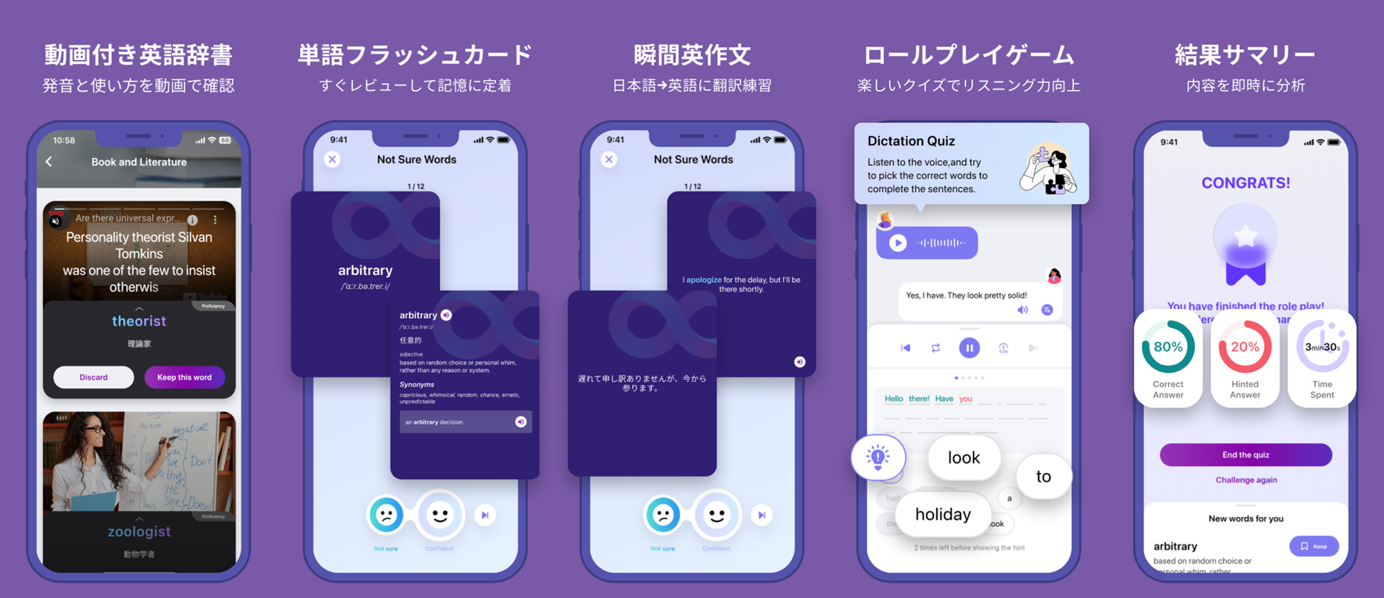 更に動画付き英語辞書、フレッシュカード機能、AI瞬間英作文機能等を組み合わせれば、ロールプレイ中に出会った単語の記憶定着、活用方法まで効果的に学習できます。
