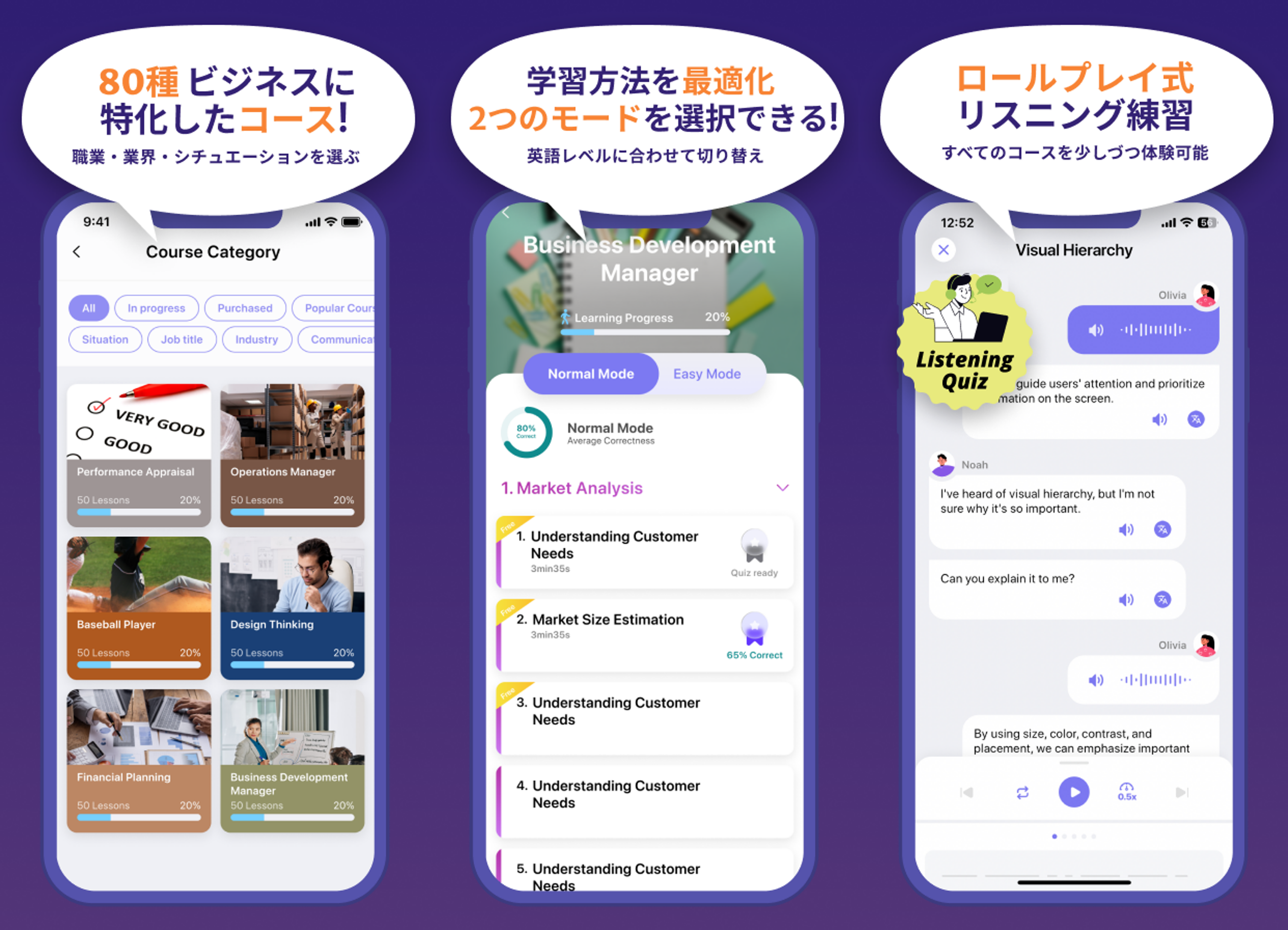 ビジネス英語コース(全80種)は各コース特有のシナリオを網羅的にカバーした50個のロールプレイレッスンで構成されています。一回5分で学習可能なロールプレイレッスンは忙しい社会人にこそ最適な長さになっています。全てのレッスンにはリスニング力を向上させる英語音声と、単語学習、ディクテーションクイズが組み込まれており、実践的な英語力を身に着けることが出来ます。