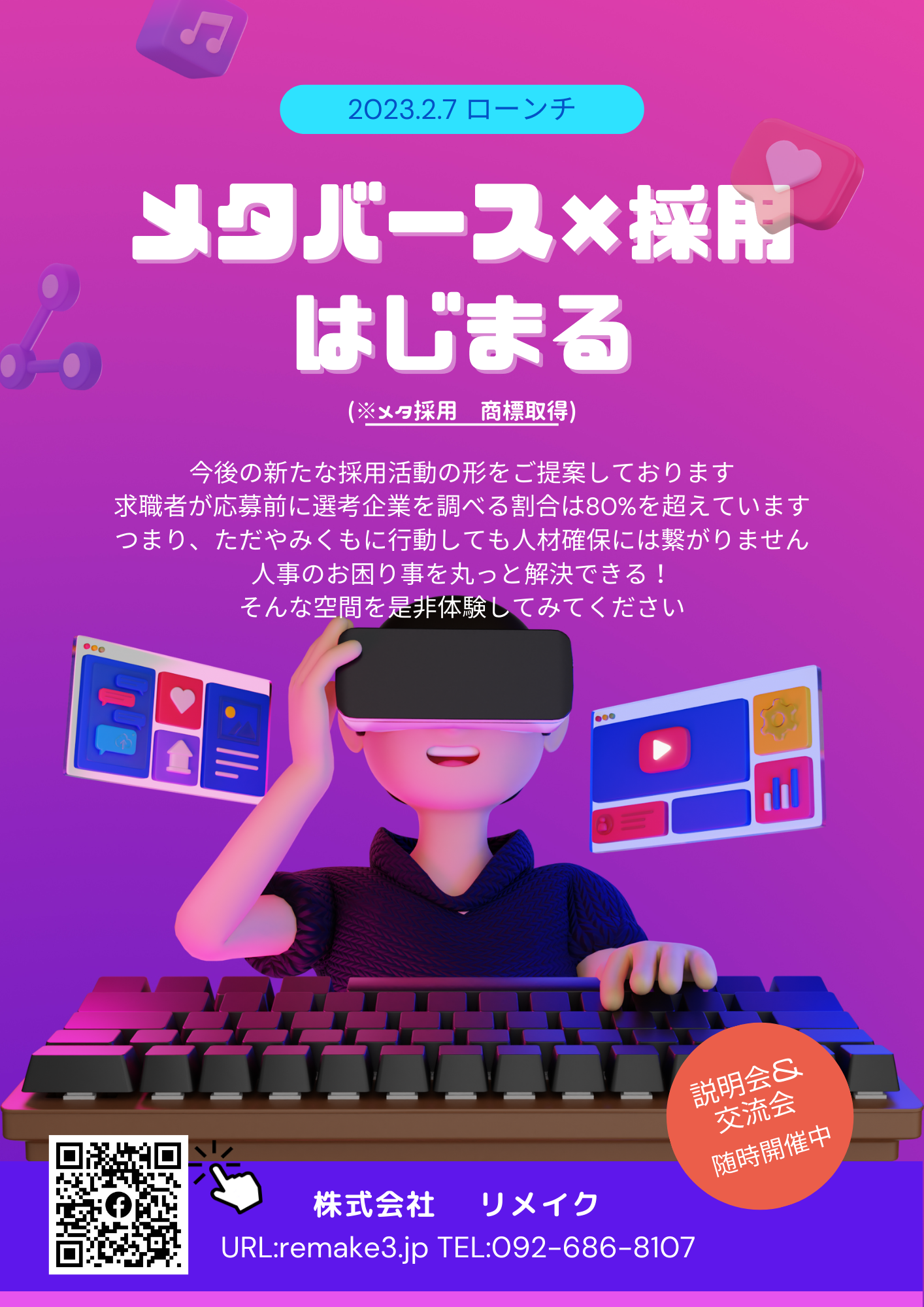 2023年2月7日、2期目を迎えた本日、採用支援事業を行う株式会社Re.make(代表取締役 池尻将太)は「メタ採用」事業をスタートし、採用の新常識を創ります。