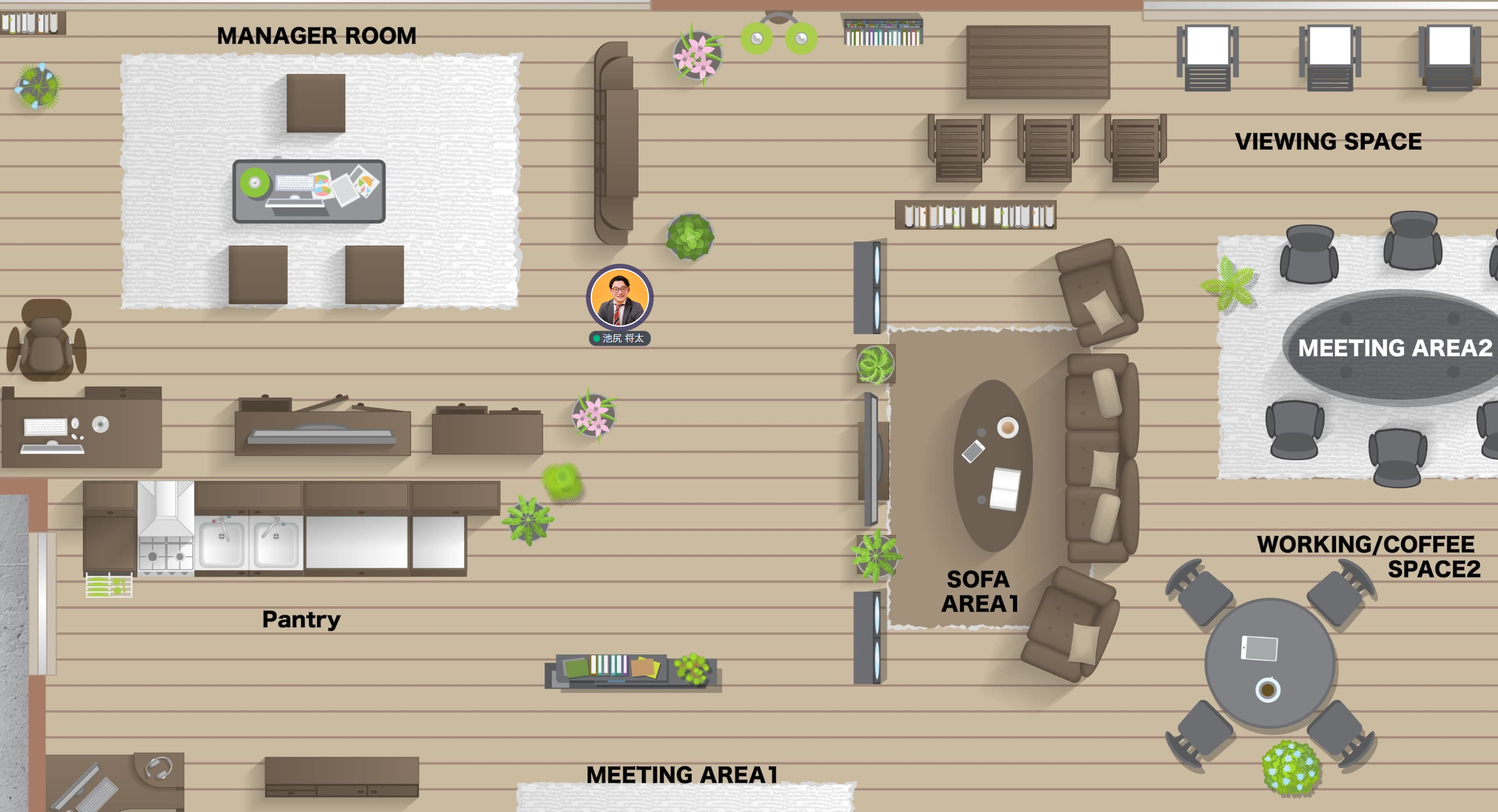 ・2Dのバーチャル空間を利用することでいつでも簡単に情報交換が可能となる仕組みを確立いたします。