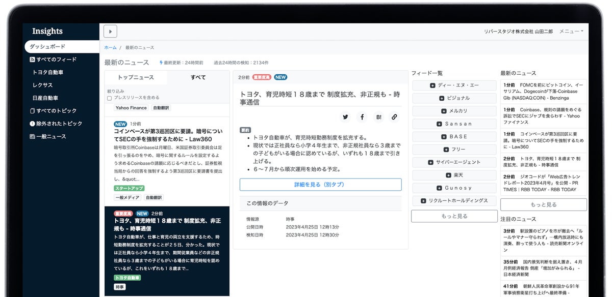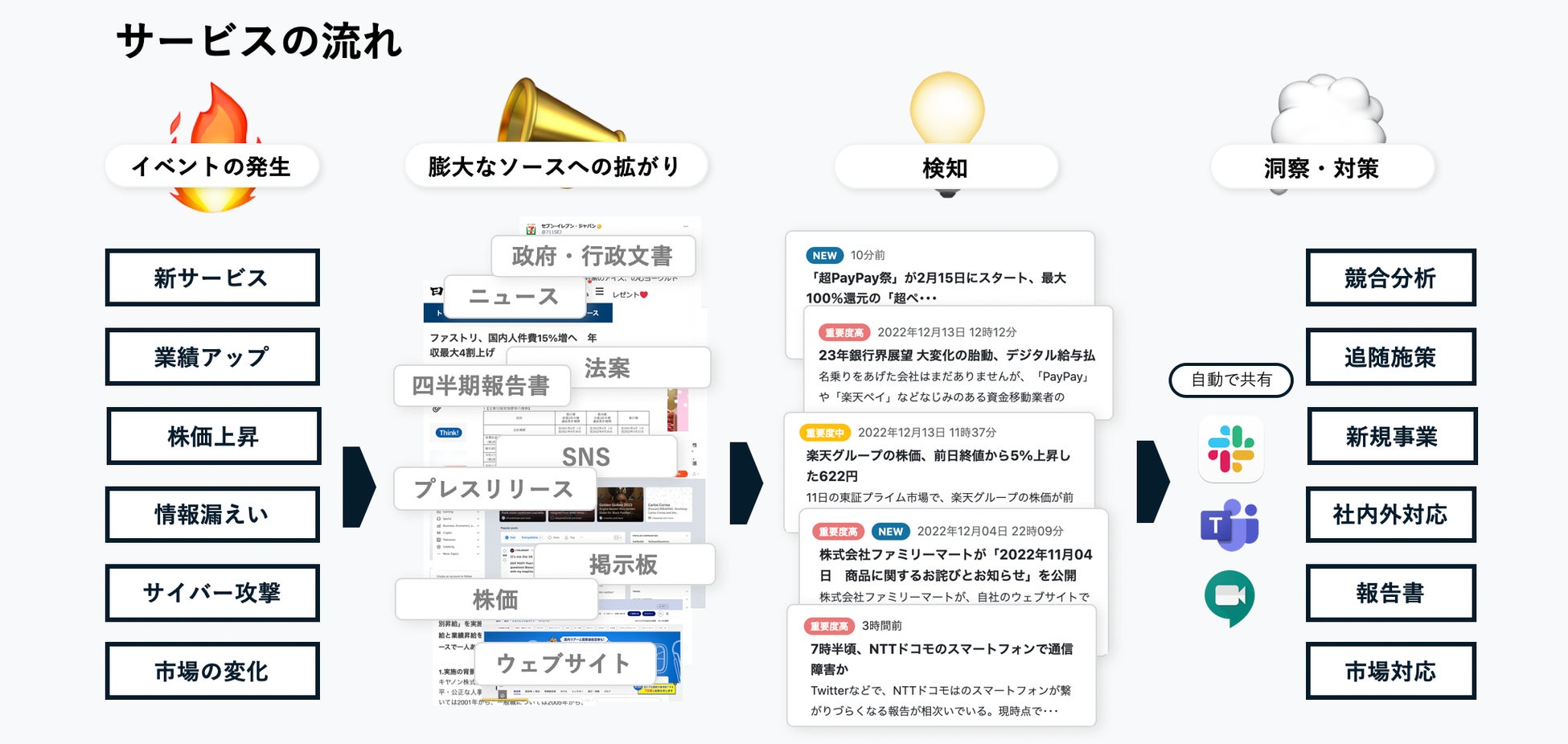 市場動向や株価、競合の施策や新規サービス、インシデント(重大事故)などについて、報道や人間の調査よりも素早く検知し、分類・評価までを AI がおこなう SaaS となっています。