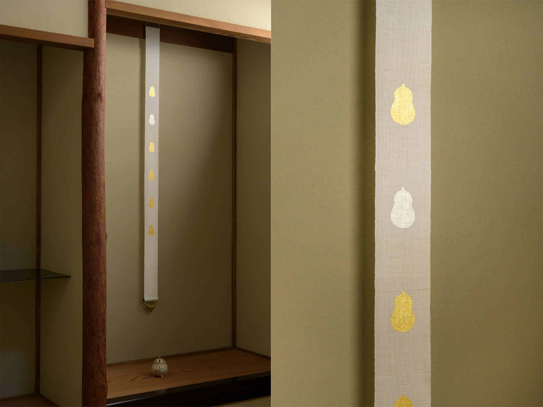 ひときわ厳かな輝きを見せる《本金箔》の細タペ。凹凸のある麻生地に箔を貼る高度な技術は金沢箔の名工房「箔一」の職人ならでは。6つの瓢箪を、本金箔と箔一オリジナルシャンパンゴールドの2色の金箔であしらいました。細タペに金の瓢箪が輝きます。