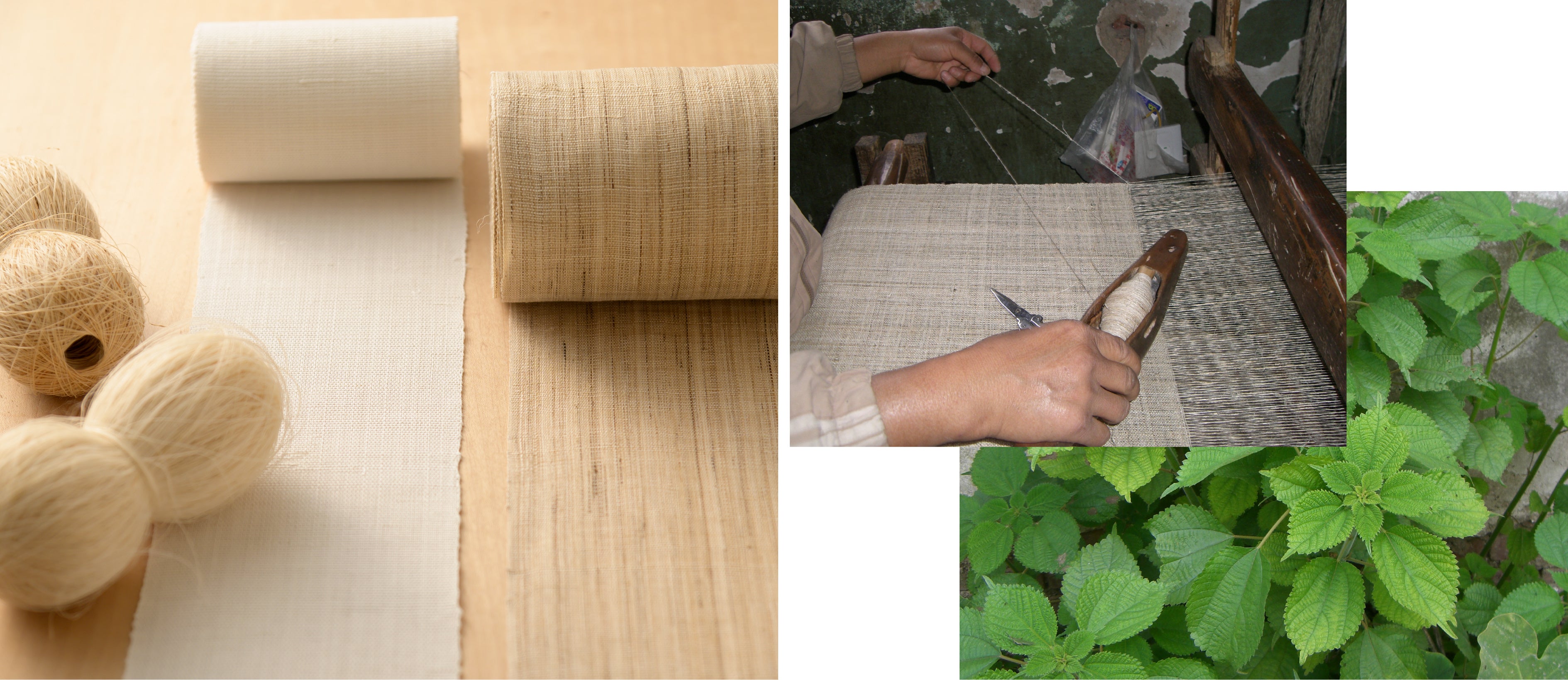 京都洛柿庵では、私たちの染めの技術を最も活かす素材として、天然の手織り麻を使用しています。国内生産もわずかとなった貴重な麻の中でも、強度があり細く織り上げることができる苧麻(ラミ ー)を原料としています。中国四川省の織工場と提携し、手紡ぎから手機までの全工程を人の手で行い、手織麻の素朴な素材感と、あたたかみを感じていただけます。