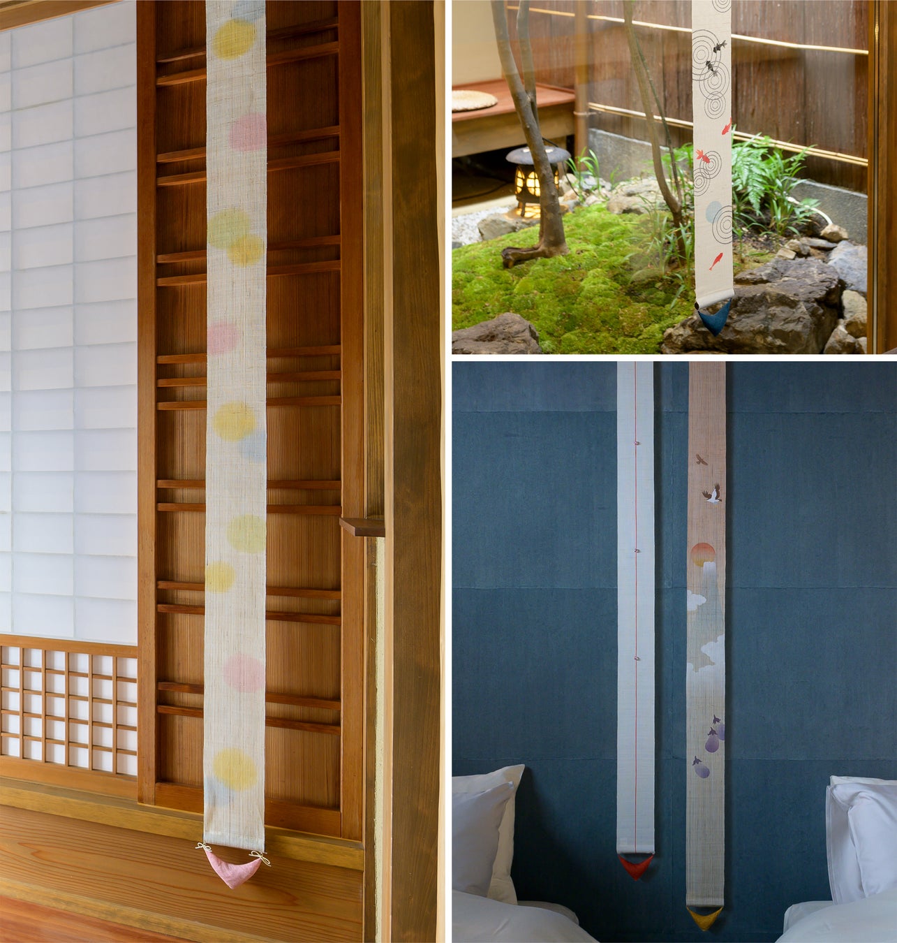 華やかに染めあげた麻に京都・宇治「昇苑くみひも」製の《京組み紐》をあしらいました。小さな装飾が、細タペに立体的な面白さを創り出してくれます。2種類の細タペは家族の結びつきを象徴するかのような優しさにあふれています。家族の幸せを祈る、思いの詰まった一枚を飾ることができるのも細タペの魅力です。
