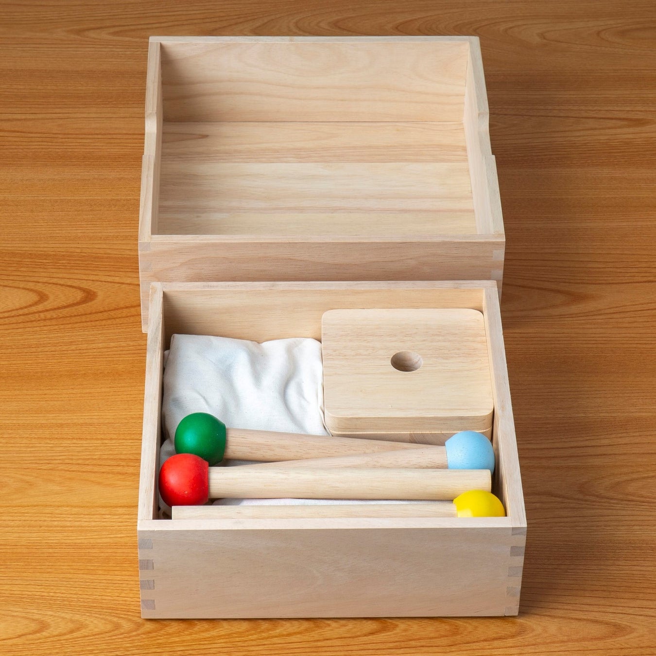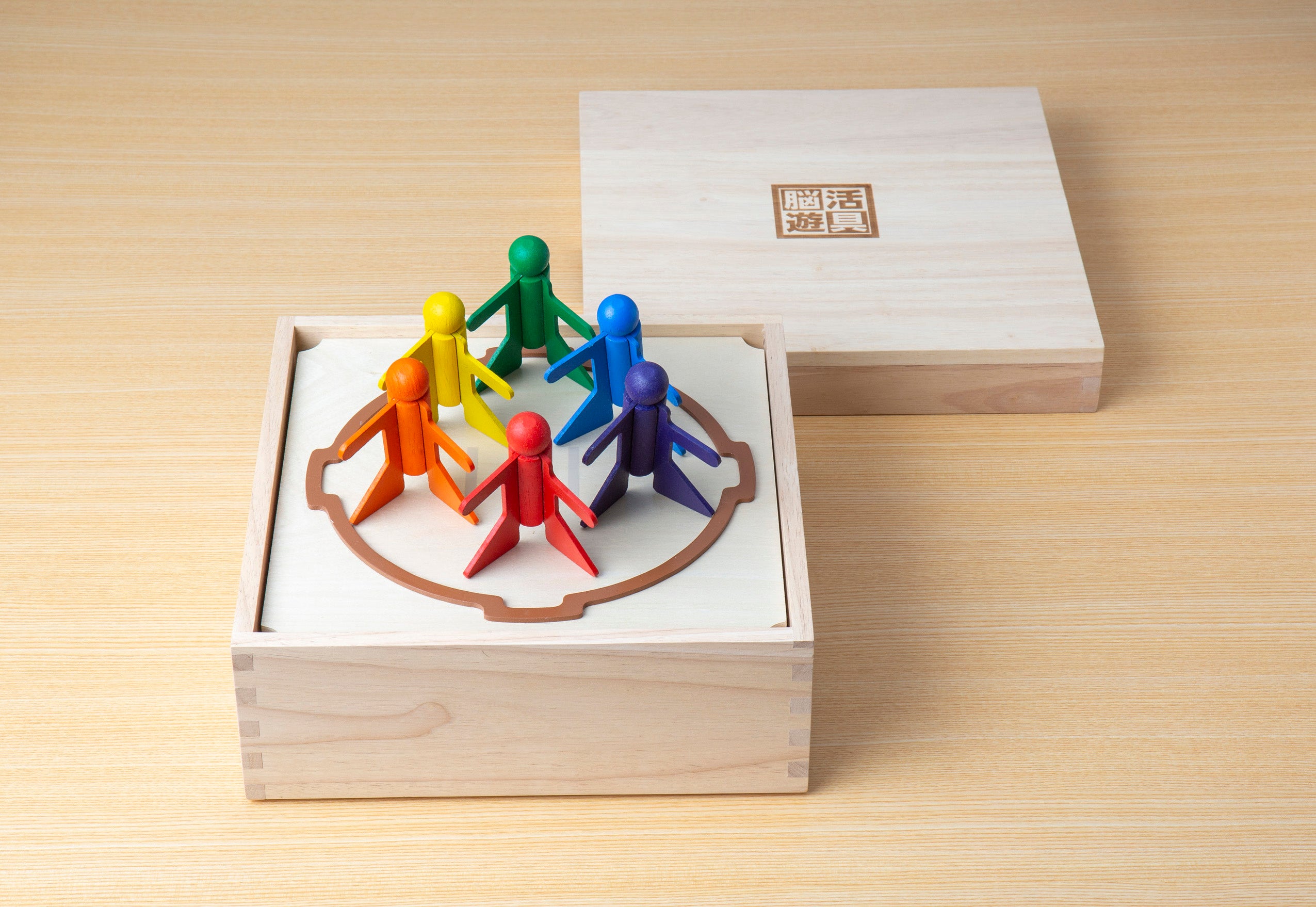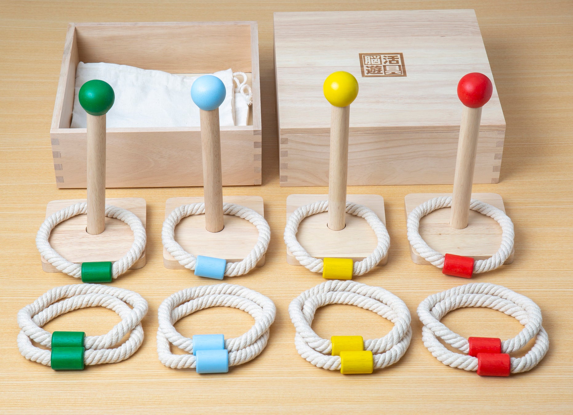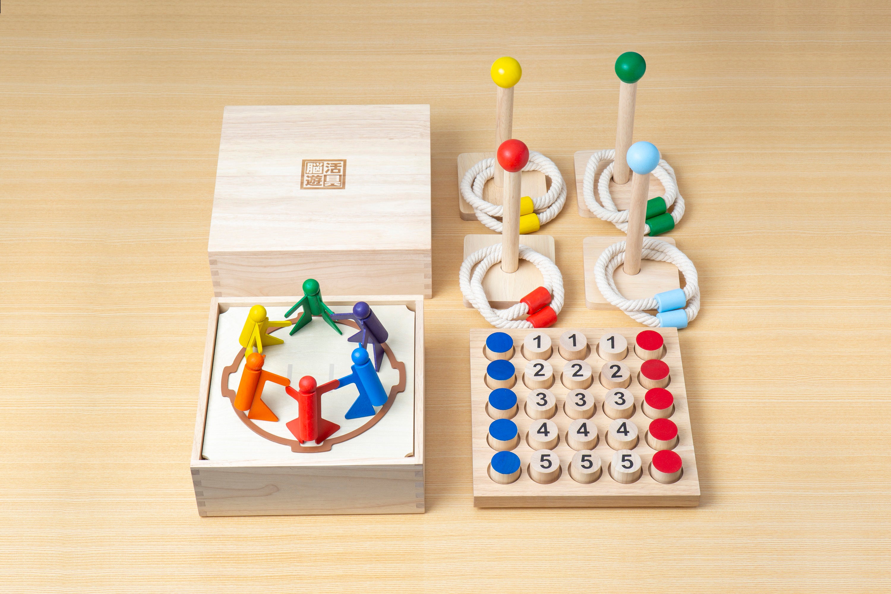 『脳活遊具』はどのアイテムも、しっかりとした作りのパーツで組み立てた頑丈な木製ケースに収めています。また、高齢の方や小さいお子さまにも識別しやすい原色系の色づけ以外は、素材の木目を生かしたナチュラルなデザインで統一しています。