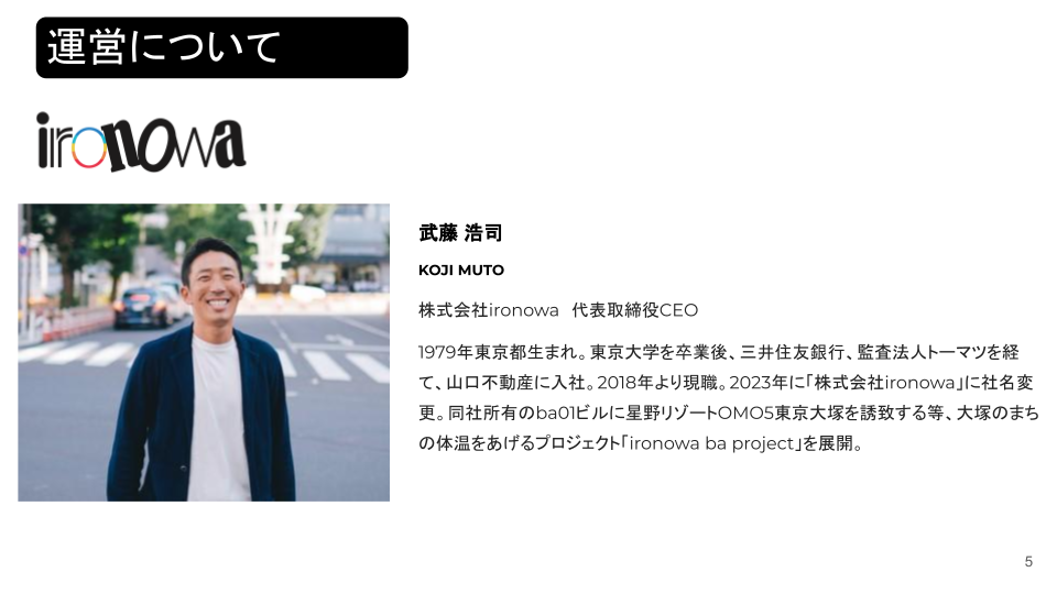 1947年設立。「大塚のまちの体温をあげる」をコンセプトに、大塚のまちの活性化プロジェクト「ironowa ba project」を展開。2018年5月に竣工したビル「ba01」にOMO5東京大塚by星野リゾートを誘致。