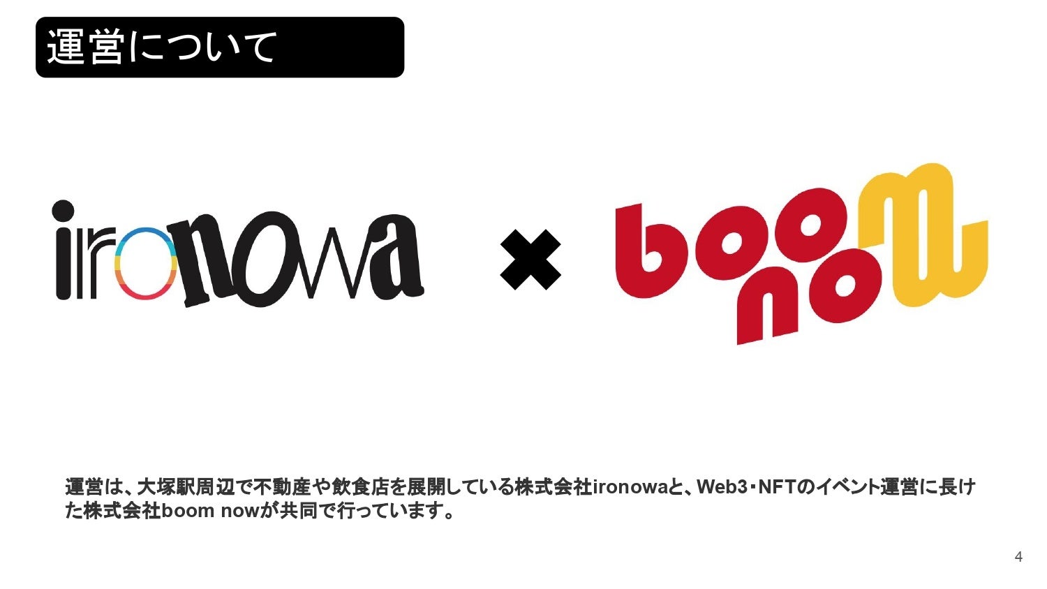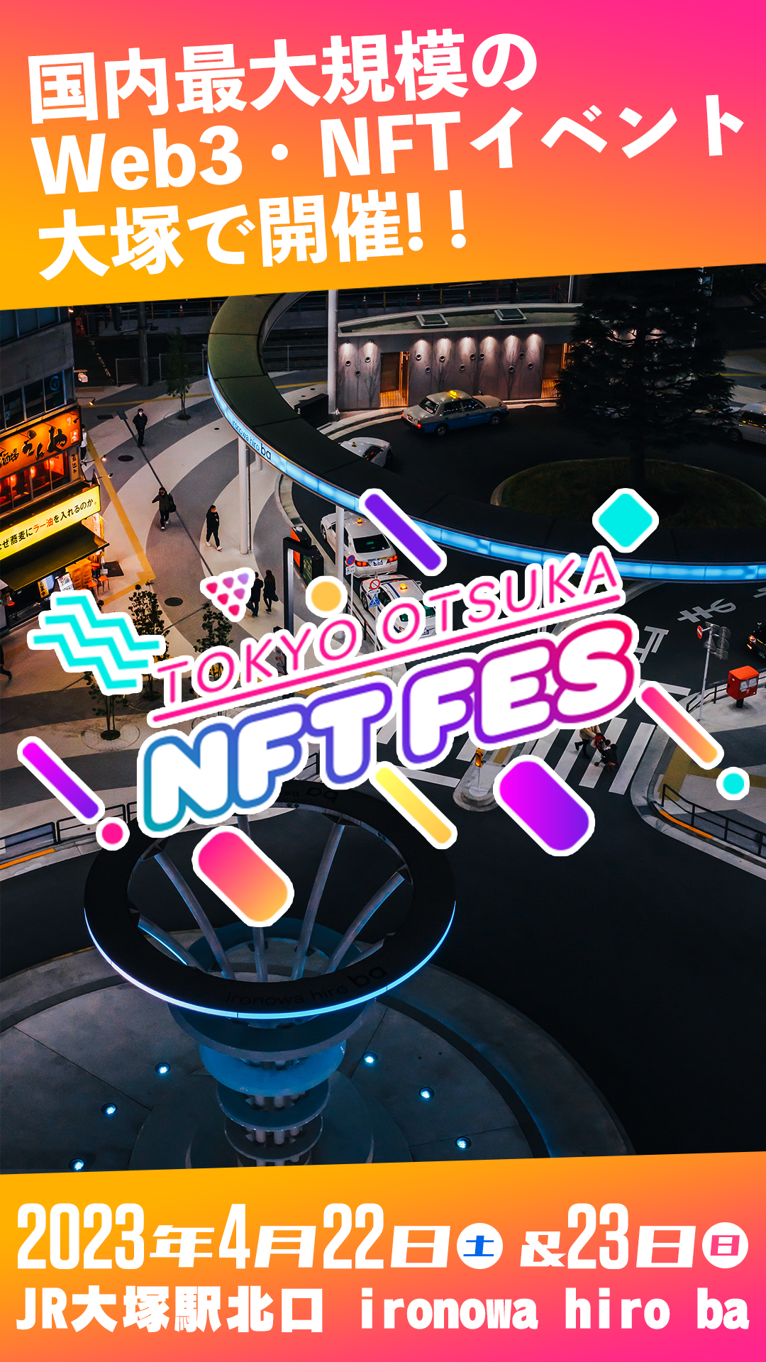 大塚駅周辺で不動産や飲食店を展開している株式会社ironowa(東京都豊島区、代表取締役:武藤浩司)と、Web3・NFTのイベント運営実績を持つboom nowが、大規模イベント「TOKYO OTSUKA NFT FES」をJR大塚駅北口周辺(ironowa hiro ba)にて開催いたします。