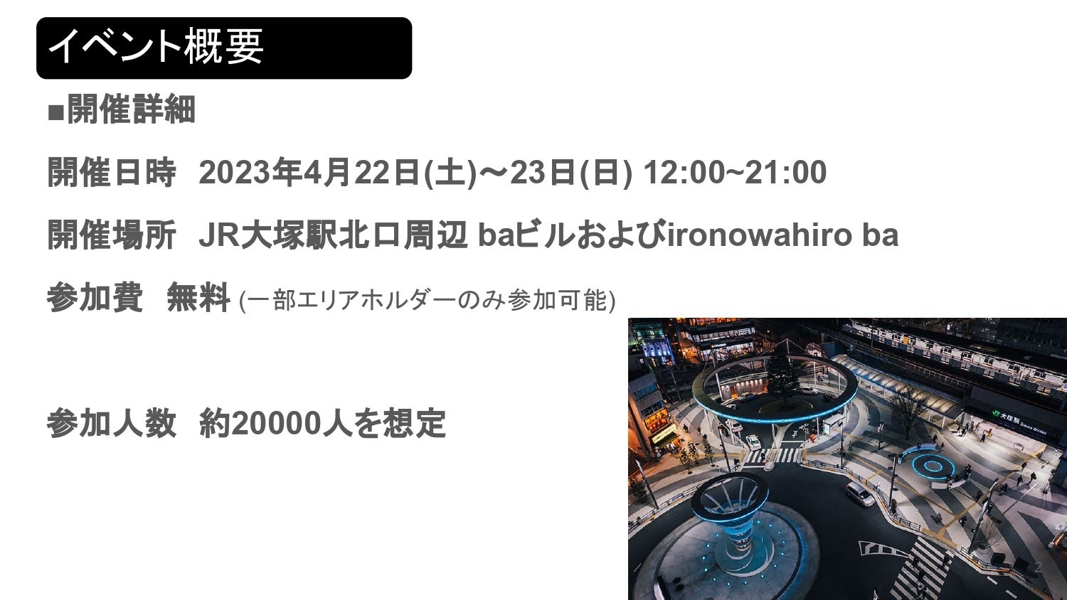 2023年4月22日(土)、23日(日)12:00〜21:00JR大塚駅北口周辺(ironowa hiro ba)にて開催