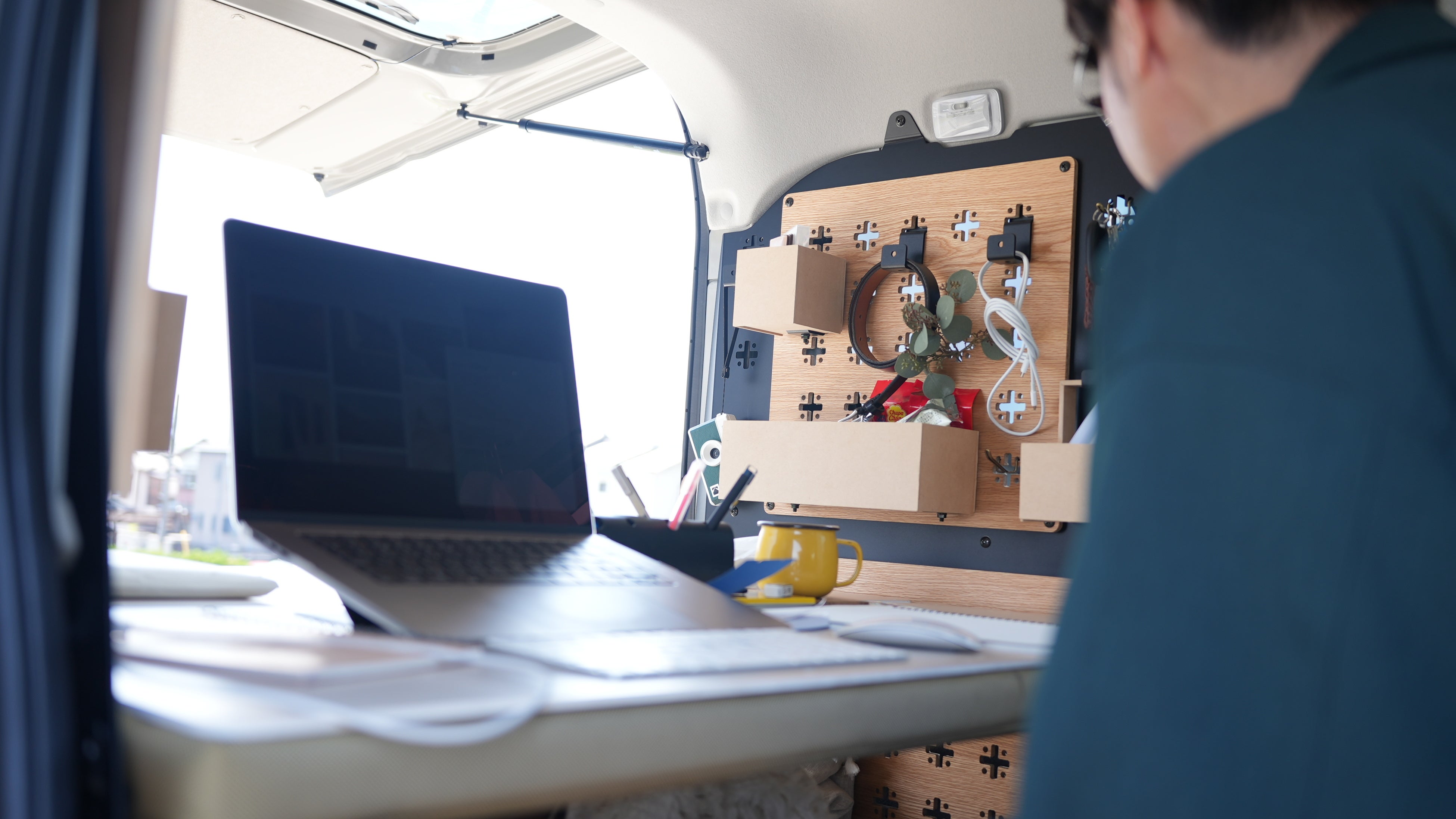 ガジェットをミリ単位で配置し、車内を即席オフィスに。