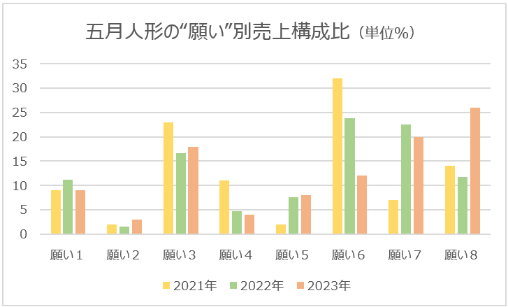 今期の五月人形商戦前半戦(2022年11月~2023年1月)の販売実績を集計し、過去2年間の五月人形の販売実績と比較した結果、お客様が好む五月人形の“願い”が、過去2年連続1位の「強さ」から、今期は「賢さ」にシフトしていることが分かりました。
