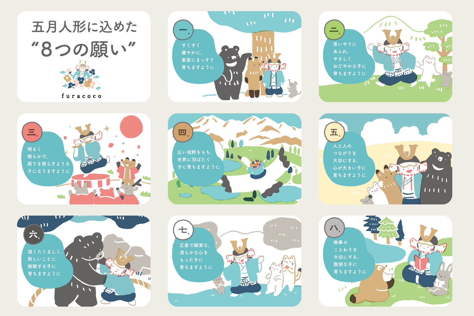 そしてふらここでは、お客様が五月人形を購入する際に、親の願いと重ね合わせて五月人形を選んでもらうために、8つの願いをこめて五月人形を制作しています。