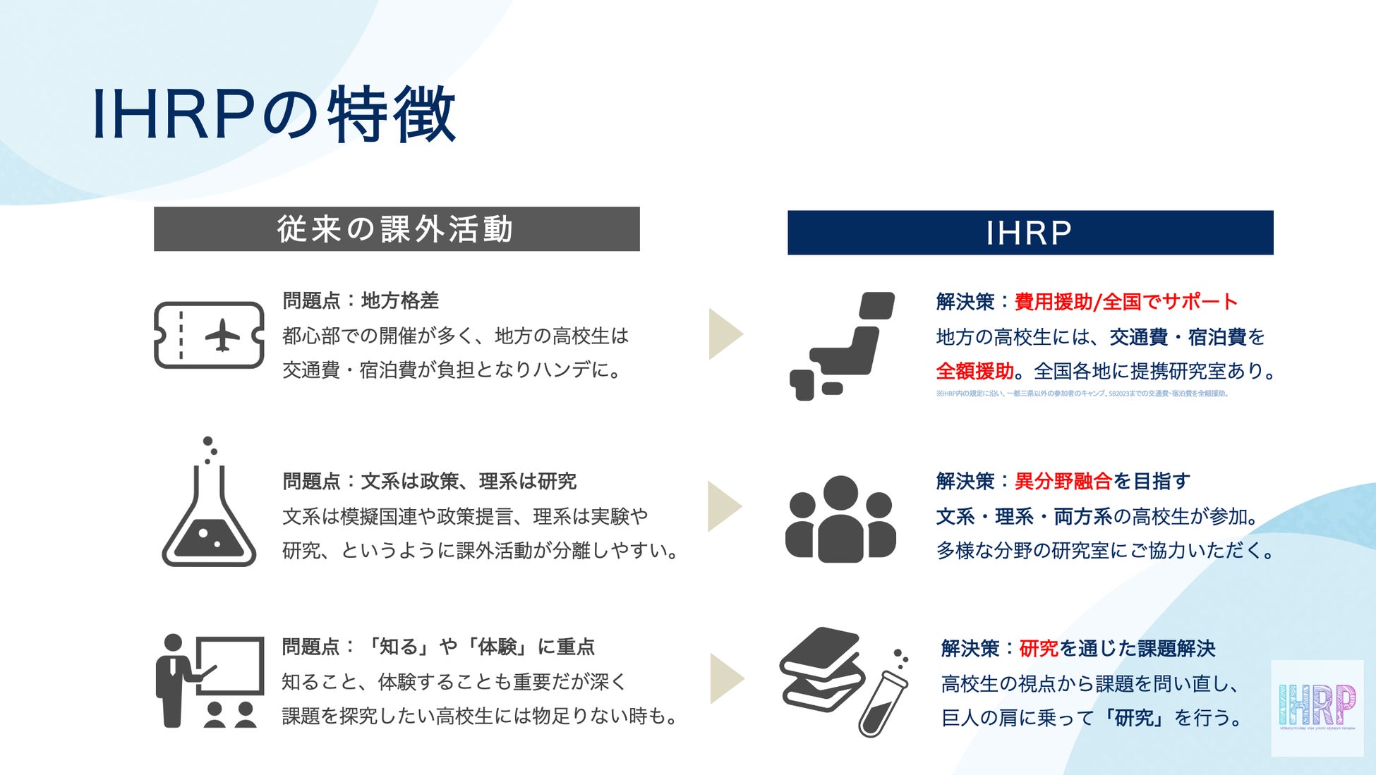 ②地方格差の是正に取り組むため、地方在住の高校生の方でも円滑に研究を進めることができる工夫を施しプログラムを企画すること。(実際に、IHRP2022の参加者の半数は地方出身です。)