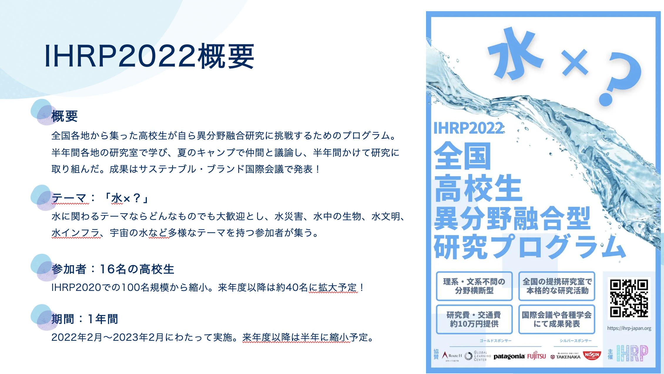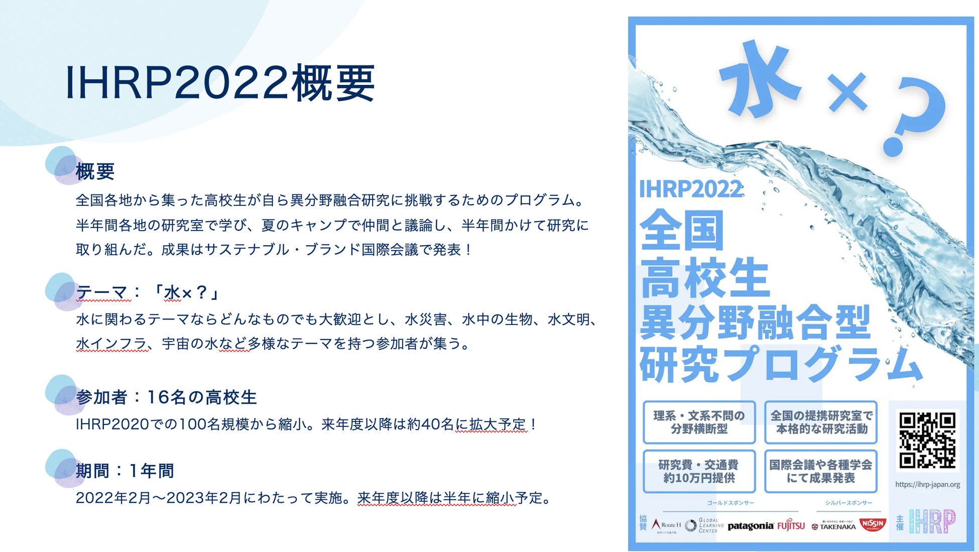 IHRPは、これまでIHRP2020、IHRP2022と2回のプログラム実施し、約115名の高校生の研究を支援して参りました。今年も新たにプログラム参加者を募集する予定です。こちらを読まれている高校生の皆様、ぜひご応募お待ちしております。