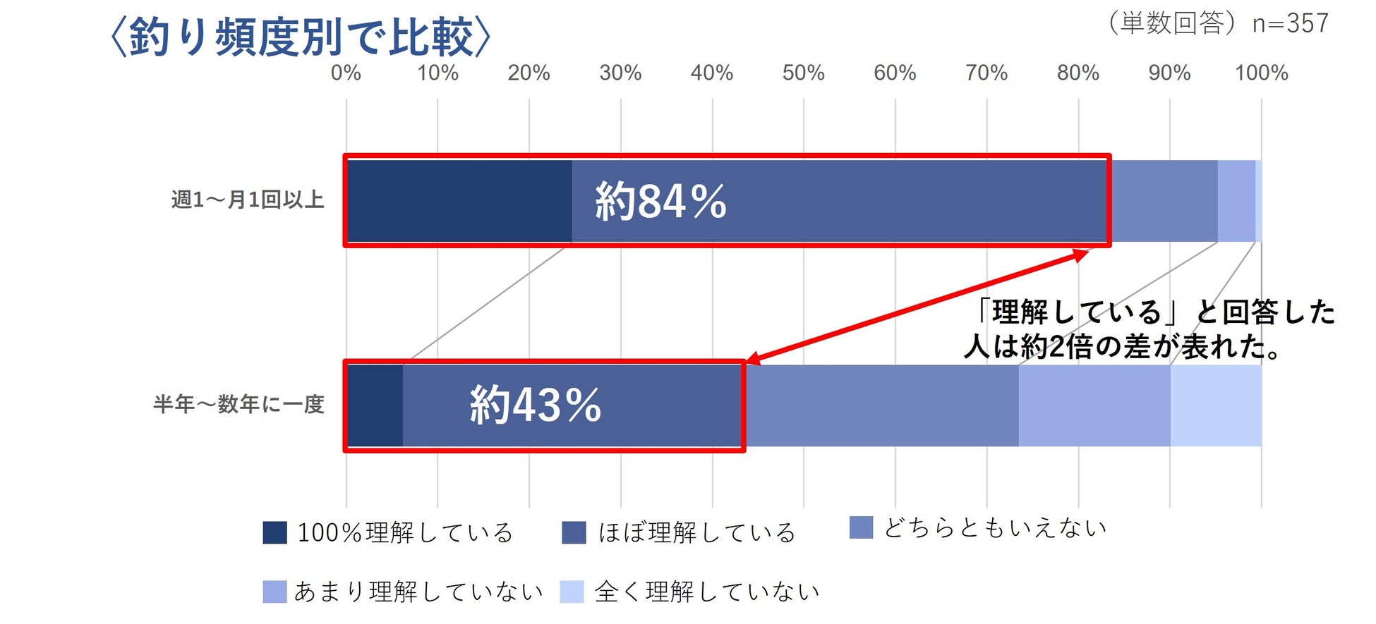 釣りを月一回以上実施している人の約8割がルールやマナーを「理解している」と回答 一方、半年~数年に1回実施の人では「理解している」は約4割に留まった