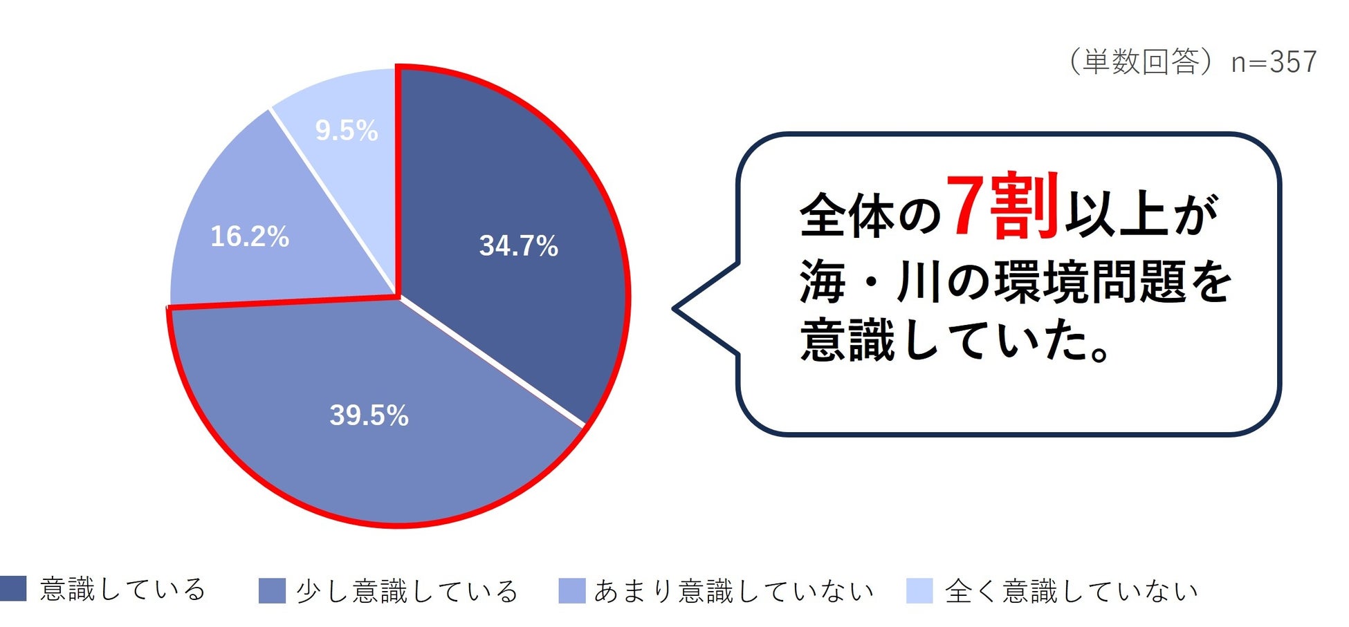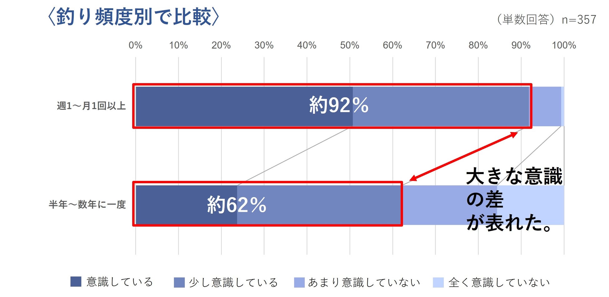 また釣りを実施する頻度別に見てみると、週1回~月1回以上で釣りを実施する人では、9割以上の人が意識しており、頻度が高いほど、海/川の環境問題への意識が高い傾向にあることがわかりました。