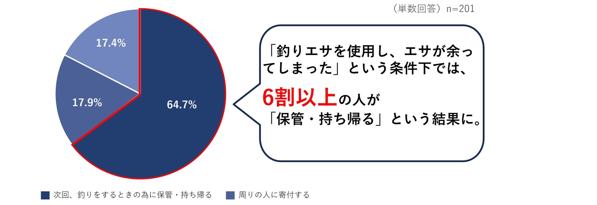 また釣りで余ったエサの処分方法を聞いたところ、「次回、釣りをするときの為に保管・持ち帰る」が最も多く、次いで「エサを使い切るため余ることはない」という結果になりました。「エサ釣りをしない」や「使い切るため余らない」と回答した人を除くと「保管し、持ち帰る」人の割合は6割以上という結果になりました。