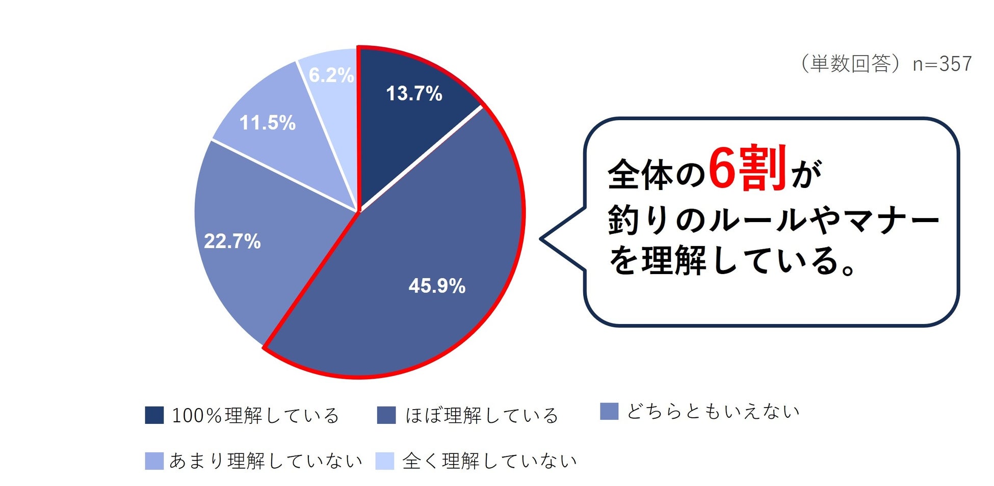 釣りを実施する頻度別に見てみると、月に1回以上実施している8割以上の人が「100%理解している」もしくは「ほぼ理解している」と回答した一方で、半年~数年に1回実施している人では約4割に留まりました。釣り実施の頻度が少ない人におけるルールやマナーの理解促進が求められています。