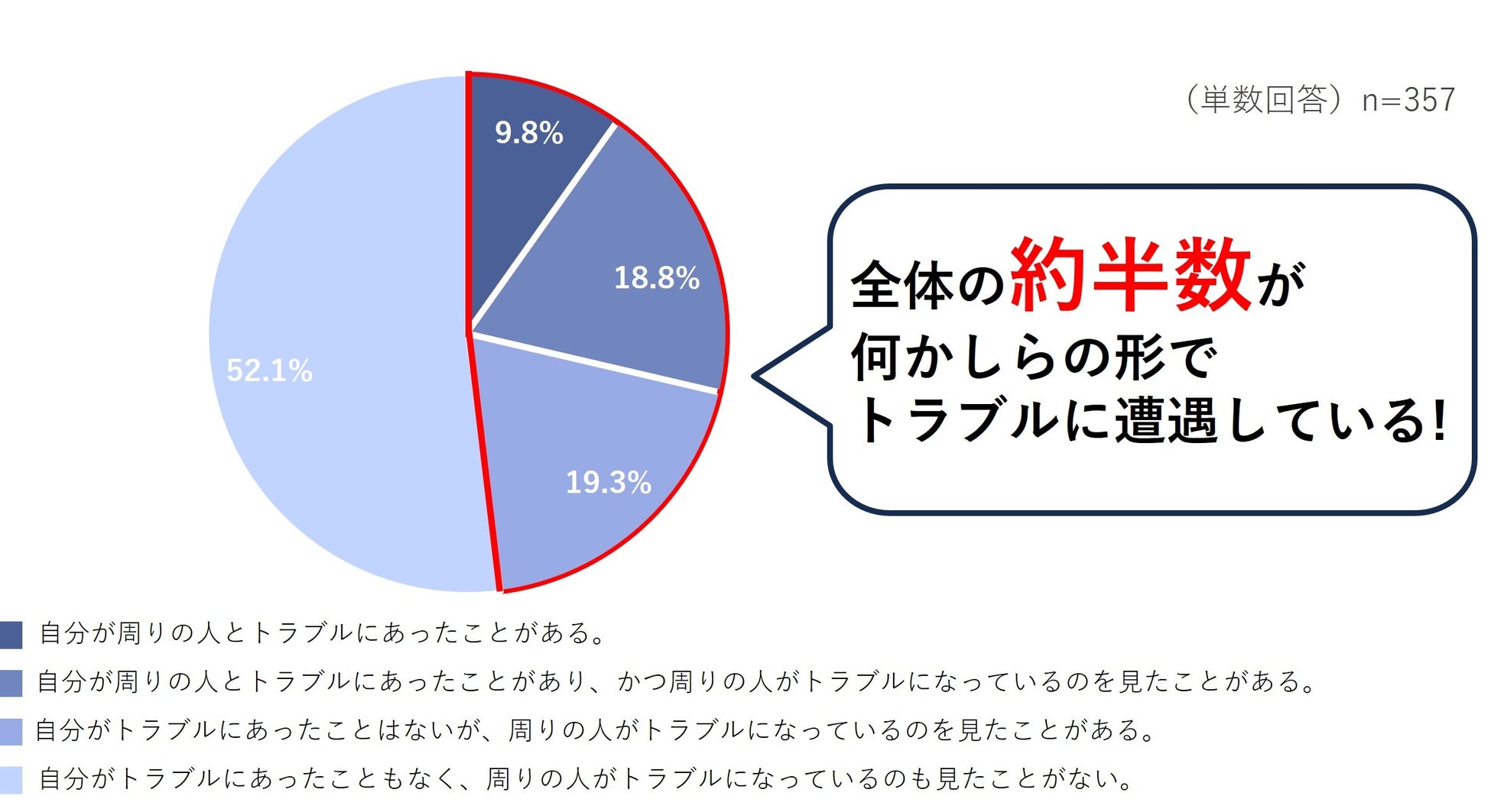 約3割の人が自身もトラブルにあったことがあると回答しました。また「自身はトラブルにあったことはないものの周りでトラブルを見かけたことがある」人も2割おり、約半数の人が釣り実施時にトラブルに遭遇した経験があることが判明しました。