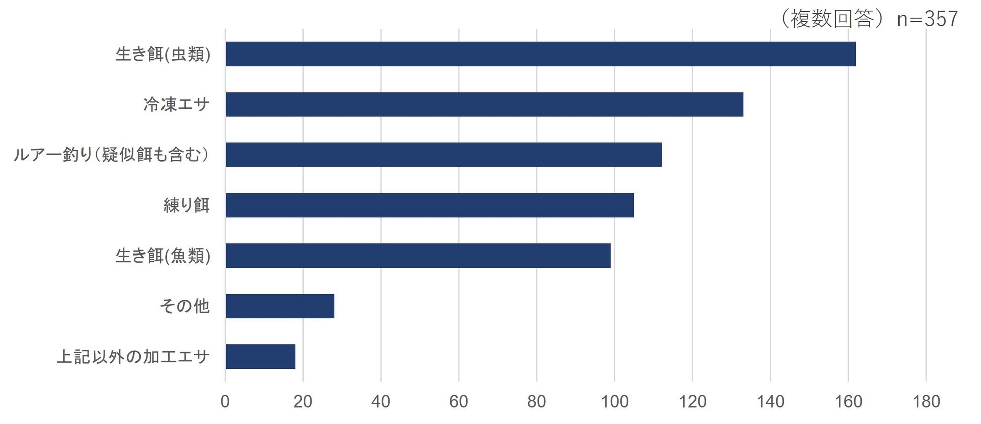 釣りで使用するエサでは「生きエサ(虫類)」が最も多く、次いで「冷凍エサ」、「ルアー類(疑似餌含む)」という結果になりました。