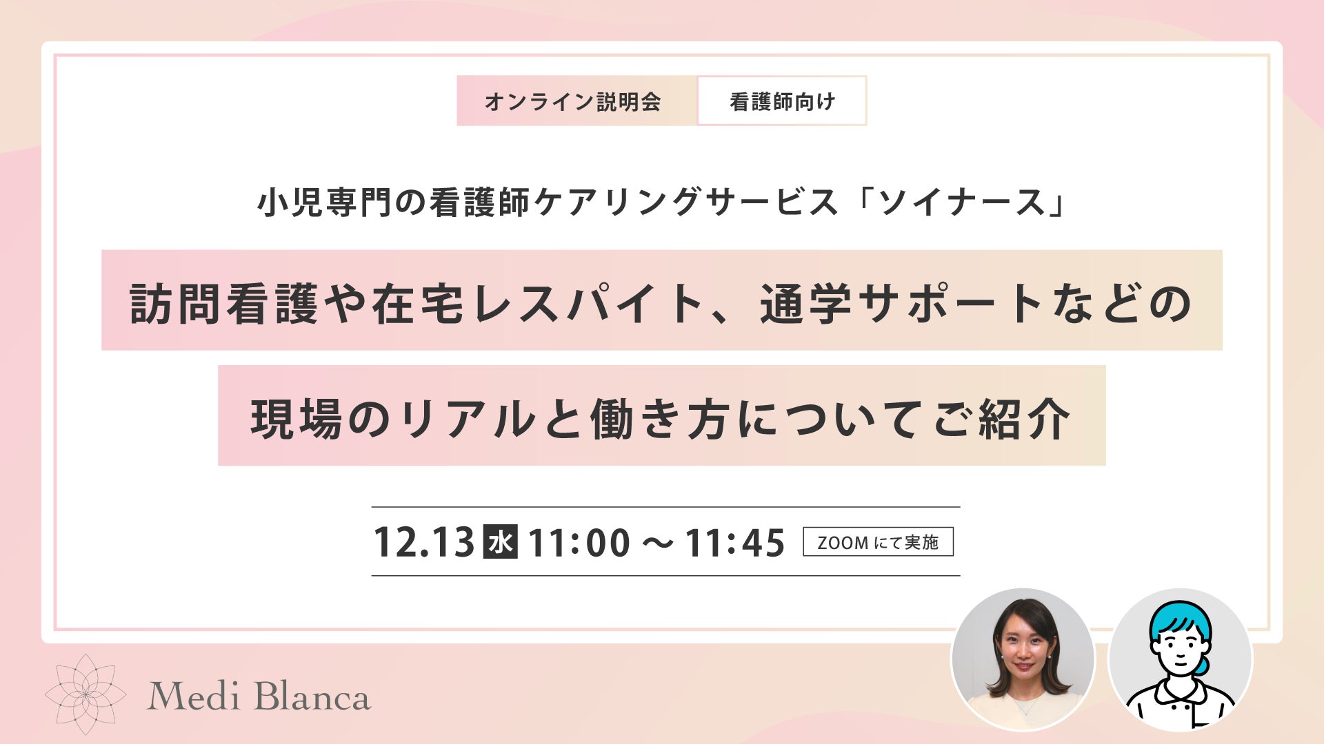 医療的ケア児や障がいを持った子どもに寄り添う小児専門の看護師ケアリングサービス「Soi Nurse(以下、ソイナース)」を展開する株式会社Medi Blanca(東京都千代田区、代表取締役:横山 佳野)は、看護師向けに初めてのサービス説明会をオンラインにて実施いたします。