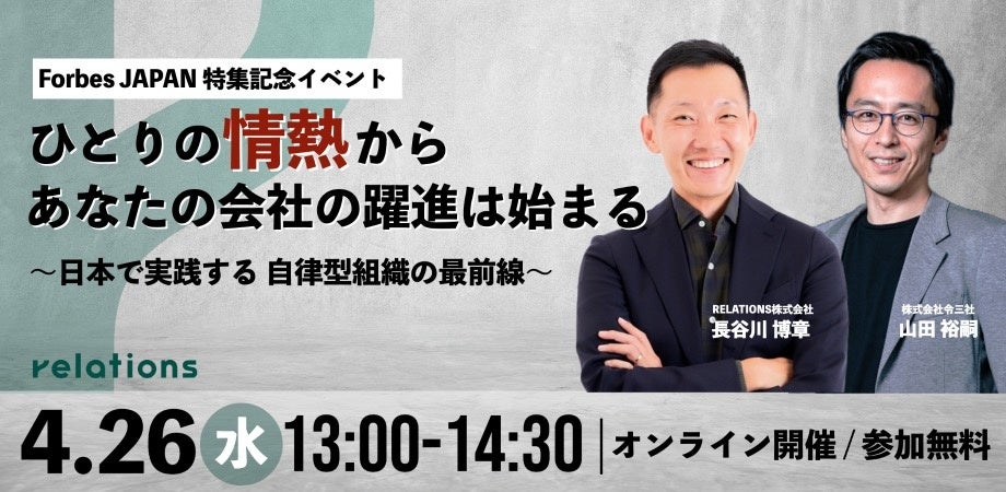 コンサルティングサービス(コスト改善・組織開発)を提供するRELATIONS株式会社(東京都港区、代表:長谷川博章、以下RELATIONS)は、2023年4月26日(水)13:00よりオンラインにて、Forbes JAPAN特集記念!ひとりの情熱から、あなたの会社の躍進は始まる〜日本で実践する自律型組織の最前線〜を開催いたします。