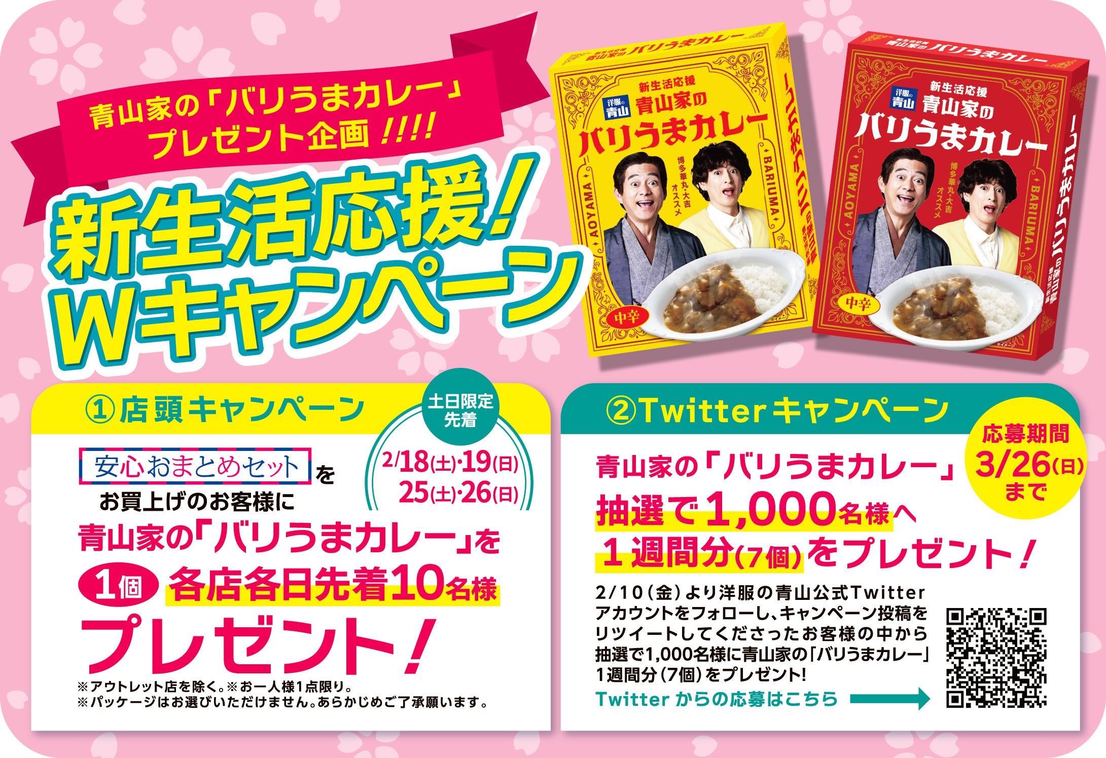 2/10(金)10:00~3/26(日)23:59の間、洋服の青山公式Twitterアカウント(@AoyamaOfficial)をフォローし、キャンペーン投稿をリツイートしてくださったお客様の中から抽選で1,000名様に1週間分(7個)をプレゼント。