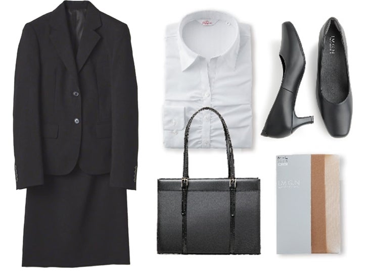 ▽計5点:スーツ ※スカートもしくはパンツ(18,700円)・ブラウス(4,290円)・バッグ(6,490円)・パンプス(8,690円)・ストッキング(550円)