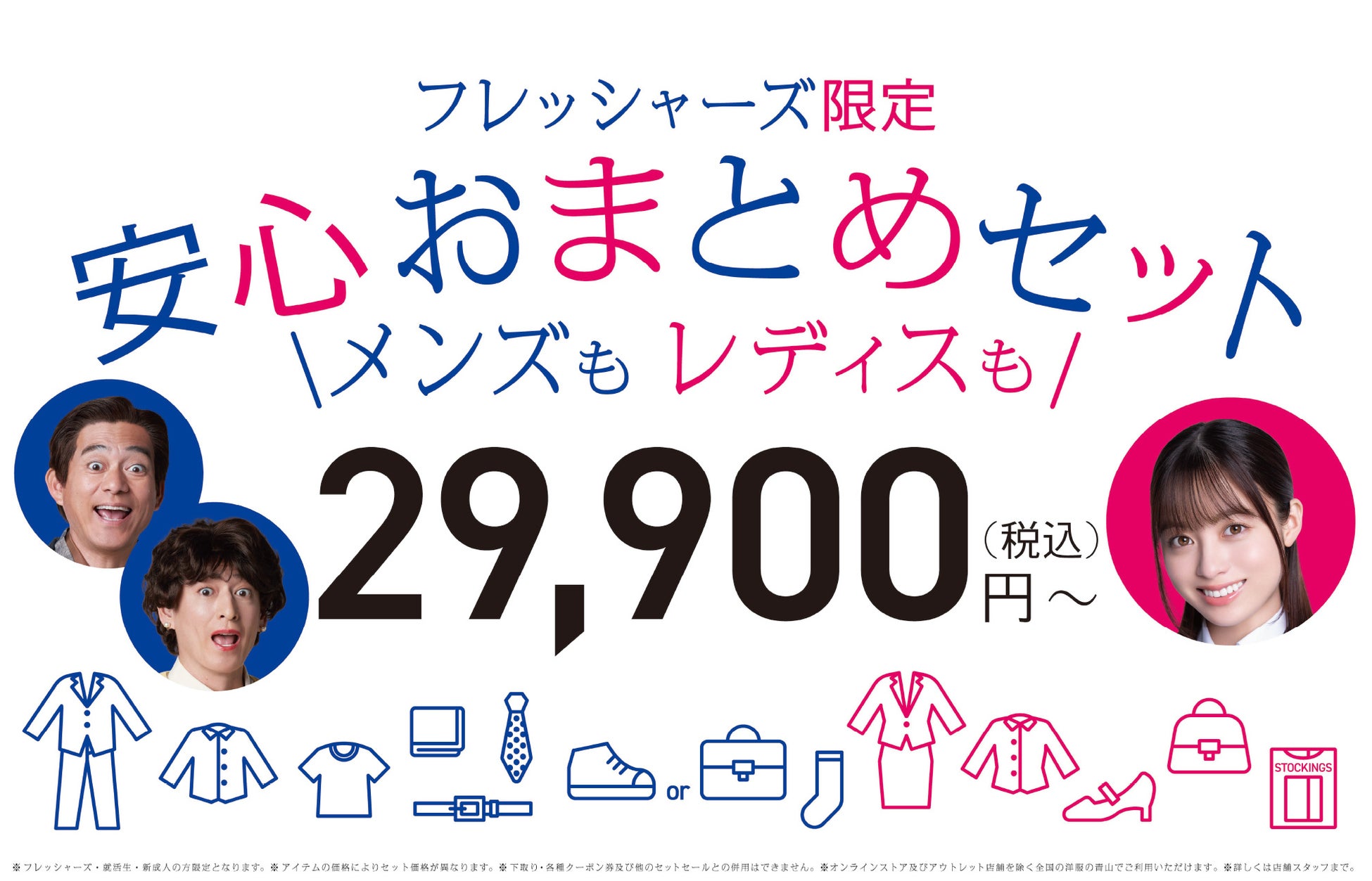 | 【新CM概要】 ■CMタイトル 『安心おまとめセット篇』 ■洋服の青山 YouTube公式チャンネル 標準語Ver.(15秒):https://youtu.be/vuiK9UbnqDI 博多弁Ver.(15秒):https://youtu.be/LKYNqzFKs3U メイキング:https://youtu.be/1Ffn7eltMXY ■フレッシャーズ特設ページ https://www.y-aoyama.jp/campaign/freshers/mens_special.html?lc=campaignpage https://www.y-aoyama.jp/campaign/freshers/ladies_special.html?lc=campaignpage |