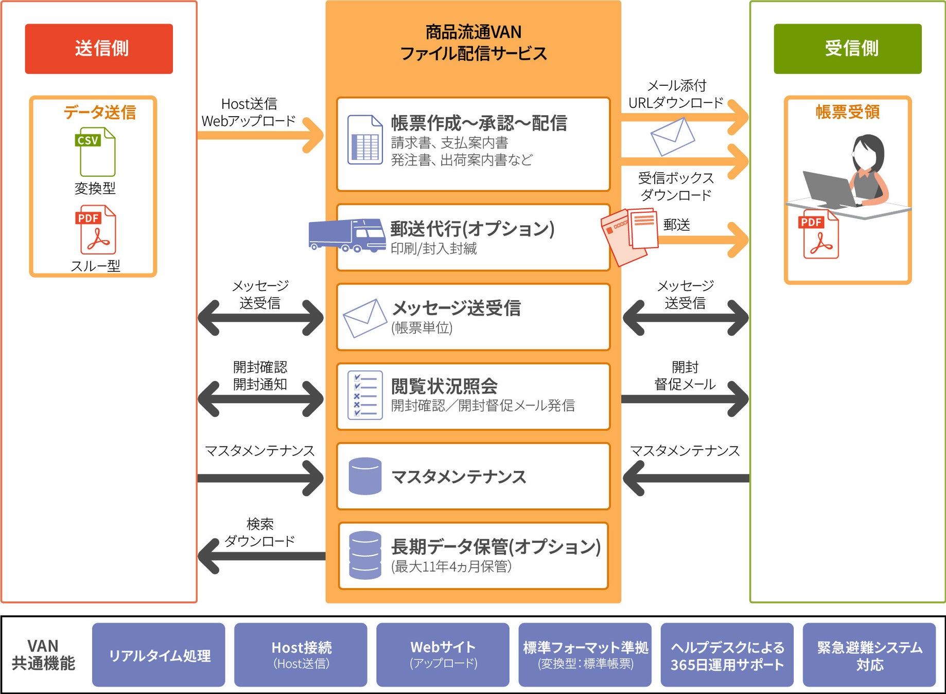 帳票イメージ(PDFファイル)は、メールやWebで受信側へ配信されます。郵送にも対応しているため、受信側の意向にあわせた配信方法を選択でき、送信側の完全電子化を実現できます。