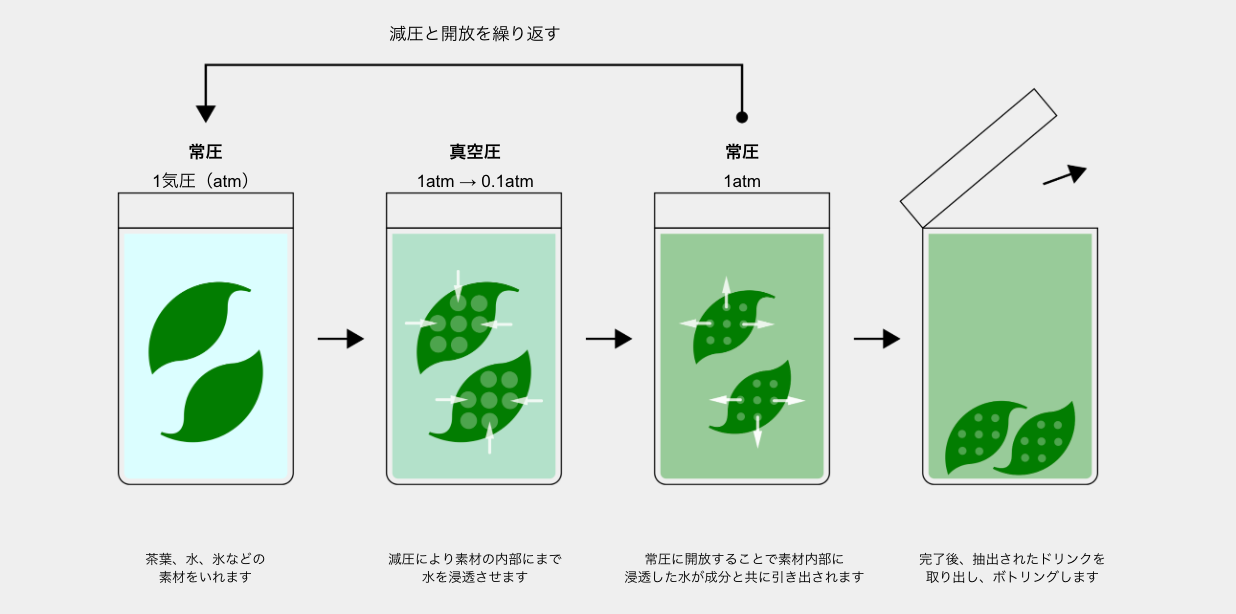 これまで一晩かかっていた低温抽出を10分に短縮したことで、レストランやバーなど飲食店で高品質なクラフトノンアルコールドリンクを簡単に提供することができるようになります。近年では欧米を中心に健康管理や自分の時間の確保などを理由に”あえてお酒を飲まない”ソバーキュリアス(Sober Curious/シラフで楽しむ)という考え方が定着し、日本でも若者を中心にアルコールを飲むシチュエーションを見極め、”あえて飲まない”もしくは”少量しか飲まない”というライフスタイルが広がりつつあります。しかし、飲食店で提供されるノンアルコールドリンクの選択肢はそう多くないのが現状です。私たちはこの点に着目し、コールドローで抽出したこれまでにない高品質なノンアルコールドリンクを開発・提供することで、お酒を飲めない人も、あえて飲まない人も、より豊かな食体験ができるように選択肢を提示していきます。