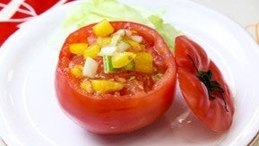 トマトをまるごと器にした一品。中身はパプリカやセロリなどが合わさったゼリーになっていて、夏らしい爽やかな味わいです。
