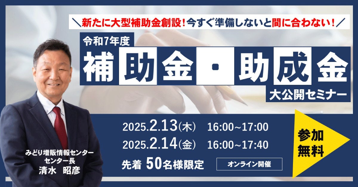 みどり合同税理士法人グループ(本社:香川県高松市、グループ代表:三好貴志男)は、2月13日(木)と2月14日(金)の2日間にわたって、「新たに大型補助金創設!今すぐ準備しないと間に合わない!令和7年度補助金・助成金大公開セミナー」を開催します。
