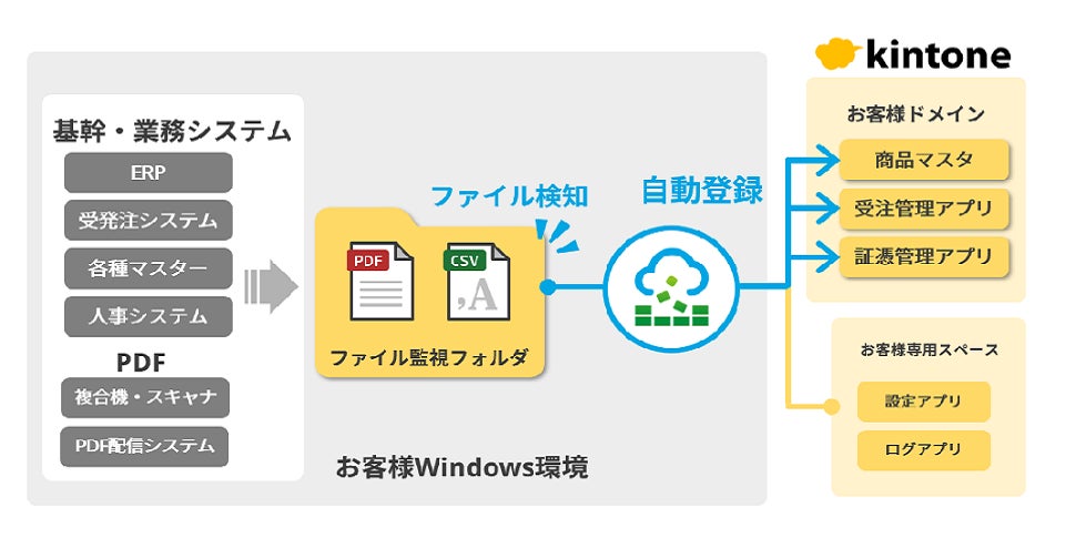データシンカーは基幹システムから出力されるCSVおよび複合機からのPDFファイルをkintoneに自動連携(ゼロタッチ連携)するサービスです。Windows OS上でアプリが常駐稼働することで、オンプレミスの業務データをシームレスにkintoneに連携することができます。