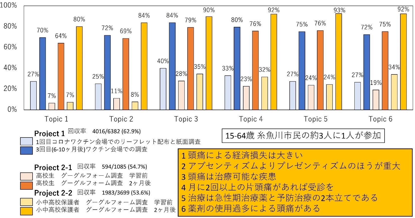 介入2: 2022年4月に糸魚川市内小中学校および高校において、好きな時間に家族で取り組めるように、頭痛に関する6つのトピックに関する内容を盛り込んだオンデマンドのeラーニング教材を配布しました。自宅で家族と一緒に取り組んでいただき、2022年6月に高校生と小中高校生保護者にその知識の定着率をオンラインで調査しました。