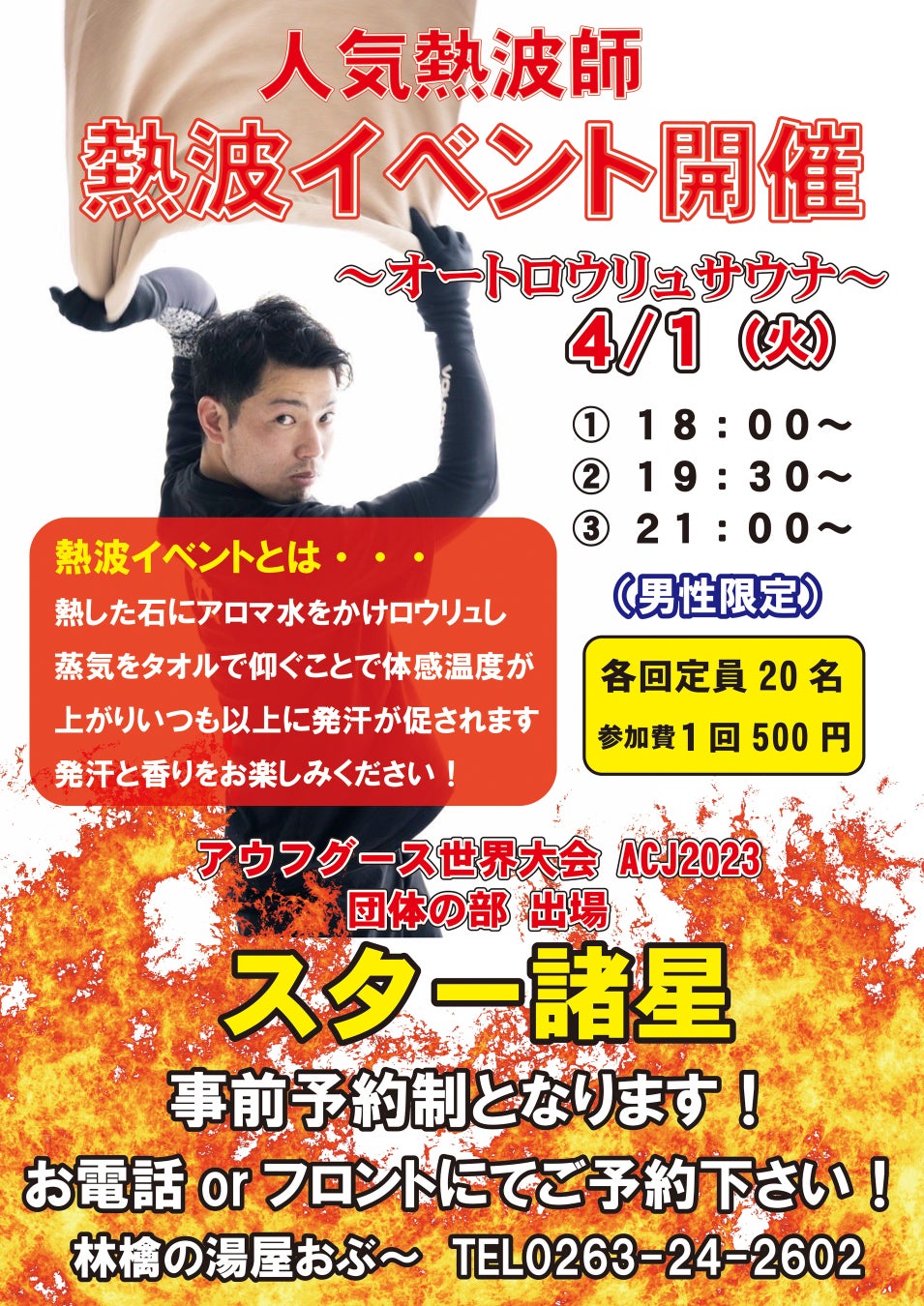 アウフグース世界大会2023団体の部で出場経歴をもつ、人気熱波師「スター諸星」さんによる熱波イベントを (1)18:00~ (2)19:30~ (3)21:00~にて開催!