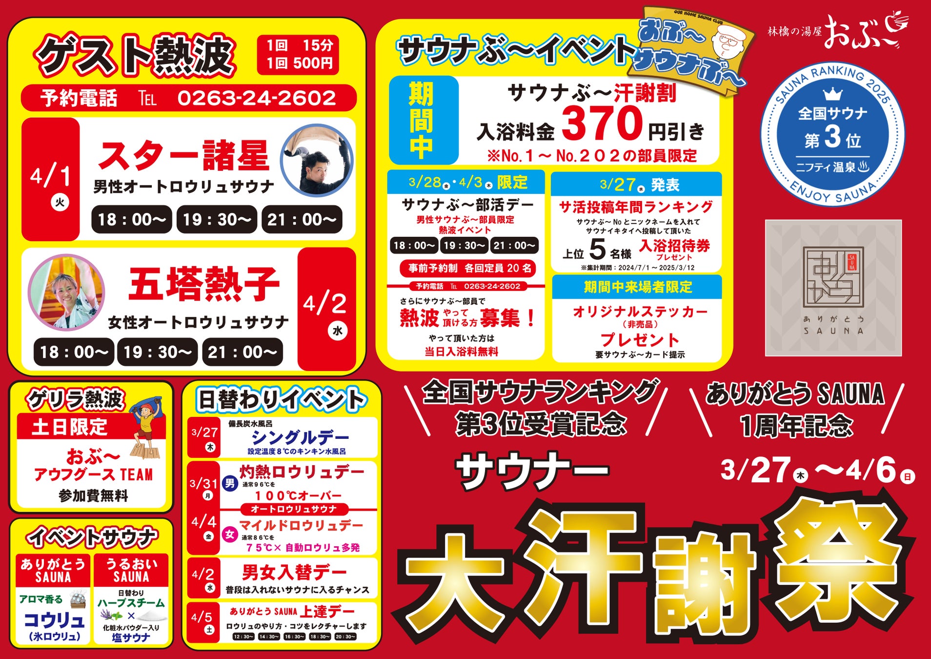 熱波イベントをはじめ、おぶ~をマイホームサウナ宣言する「おぶ~サウナぶ~」入部者限定イベントも!盛りだくさんの11日間です。