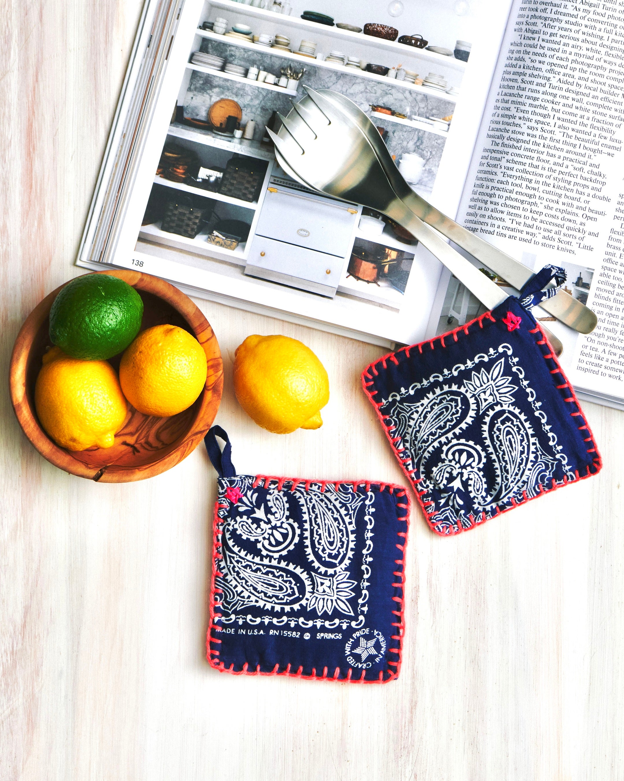 その試みの第一弾として行ったのが、世に出ないサンプルや試作品など、本来は破棄されてしまうはずのものをアップサイクルすること。とあるママのもとで、ヴィンテージのバンダナと組み合わせ、一つ一つ表情の違うハンドメイドのスペシャルな鍋つかみへと仕立てられていきます。