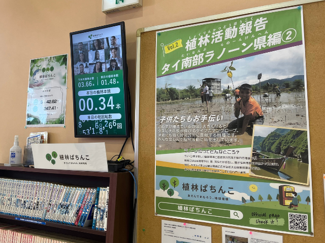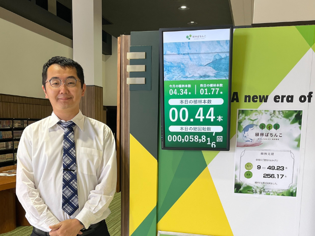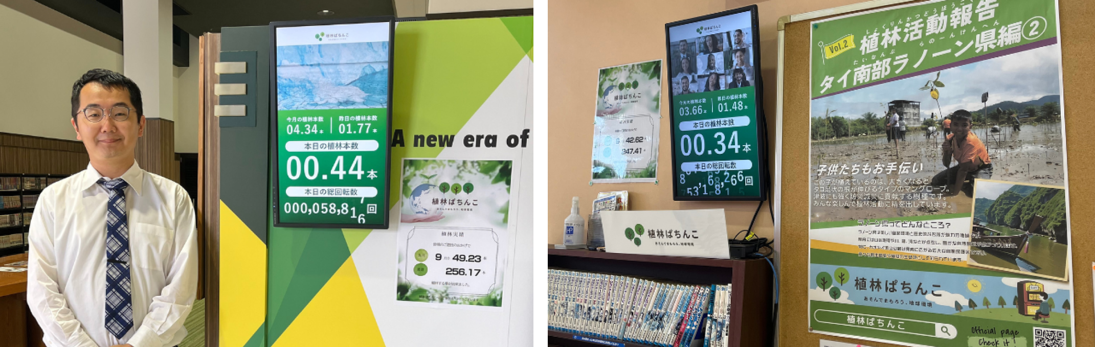 当店では、サイネージ画面での植林本数の表示と、植林活動の報告ポスター掲示を行っています。「良い取り組みですね」というお声がけや、初めてご覧になったお客様からのお問い合わせをいただくことがあり、取り組みについての認知や関心をいただいていると感じます。いつもの遊びが社会貢献につながる取り組みですので、より多くのお客様に知っていただき、ご参加いただきたいと思っております。(楽パチや 会社代表者様)