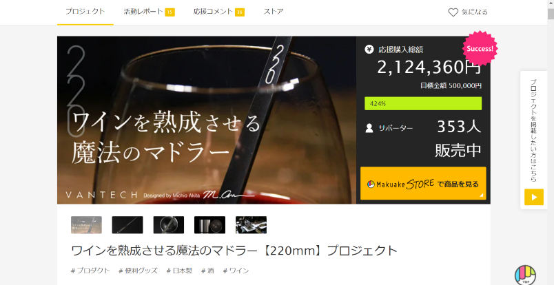 尚、魔法のマドラーは2019年にMakuakeで行ったクラウドファンディング(プロジェクト名:ワインを熟成させる魔法のマドラー【220mm】プロジェクト)で、応援購入総額2,124,360円、達成率424%を達成するなど多くの支援を集めて開発された商品になります。