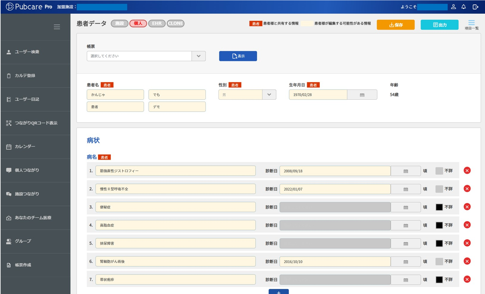 ※約153項目が集約されている「患者データ」。Pubcareで患者情報を常時確認出来る連携体制を構築することで診療報酬点数「在宅医療情報連携加算」の算定が可能。