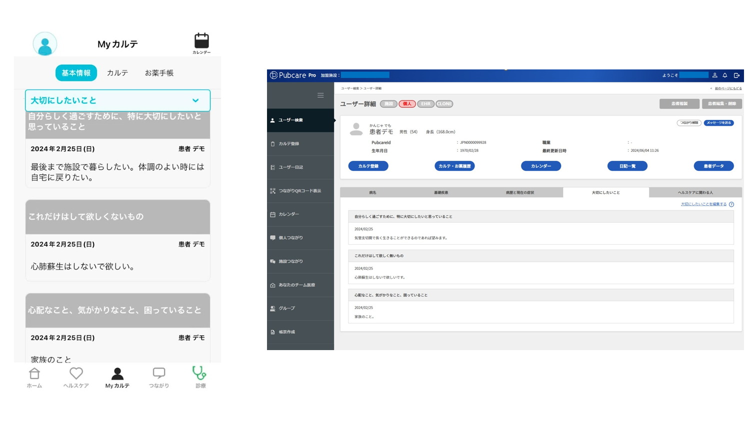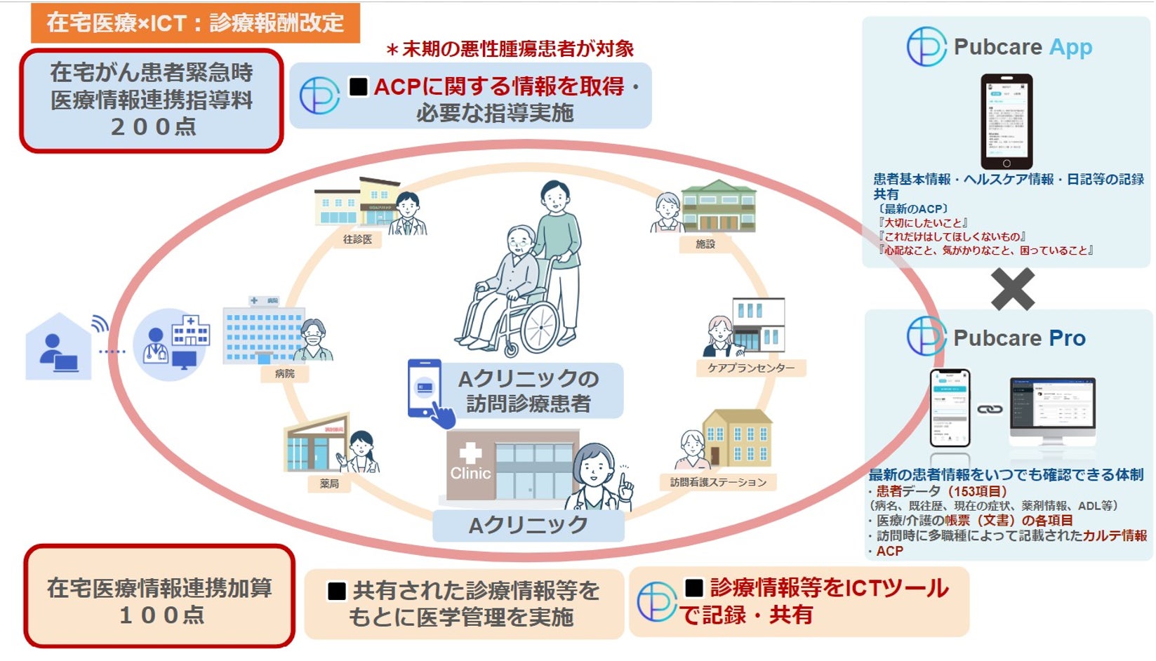 ※Pubcare appで記録した患者のACPが医療介護従事者専用のシステムに反映される。PubcareでACPを共有し、