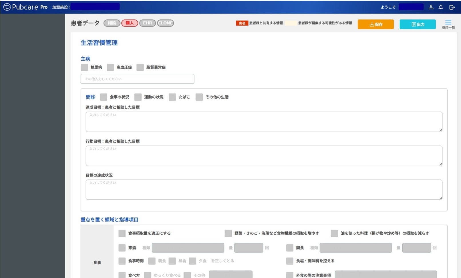 2024年の診療報酬改定では、人口当たりの有病率の高い生活習慣病である3疾患に対する診療報酬体系が見直され、医療機関は総合的で質の高い生活習慣指導が求められるようになりました。生活習慣の適切な改善指導が必要とされるため、医療機関は療養計画書の作成を求められています。ICTツールPubcareは、患者 さまの来院からお会計までのフローにおいて、生活習慣病管理指導に携わる全てのスタッフが連携して療養 計画書を作成できるように設計されています。これにより、外来診療スタッフの業務負担を軽減しつつ、効 果的に療養計画書を作成することが可能です。
