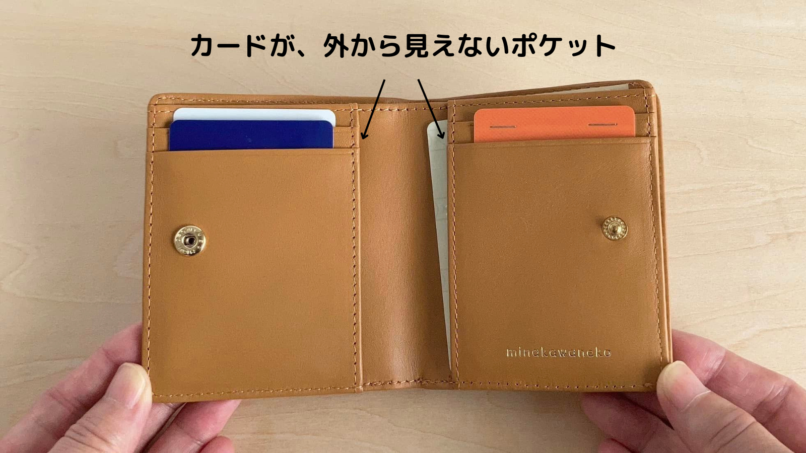 ②コンパクトに持て、使いやすい仕様の二つ折り財布