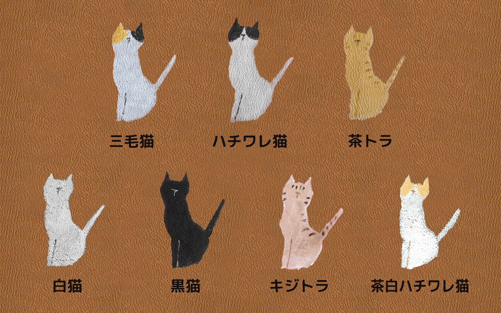猫の種類は、三毛猫・ハチワレ猫・白猫・黒猫・茶トラ・キジトラ・茶白ハチワレ猫の7種類。