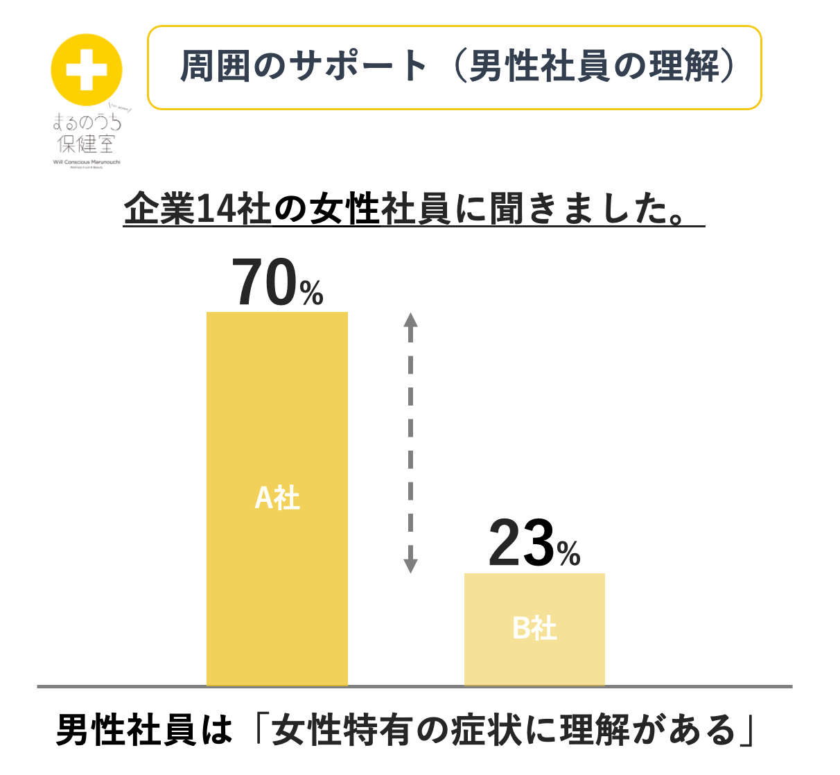 女性特有の症状に理解があると回答した男性社員は、最も高い企業で約7割、最も低い企業で約2割で、企業によって乖離があった。男性理解あると感じている女性の方がワークエンゲージメント(活力・没頭・熱意)や仕事満足度が高く、月経困難症・PMS・更年期症状の緩和との関連性も見受けられる。