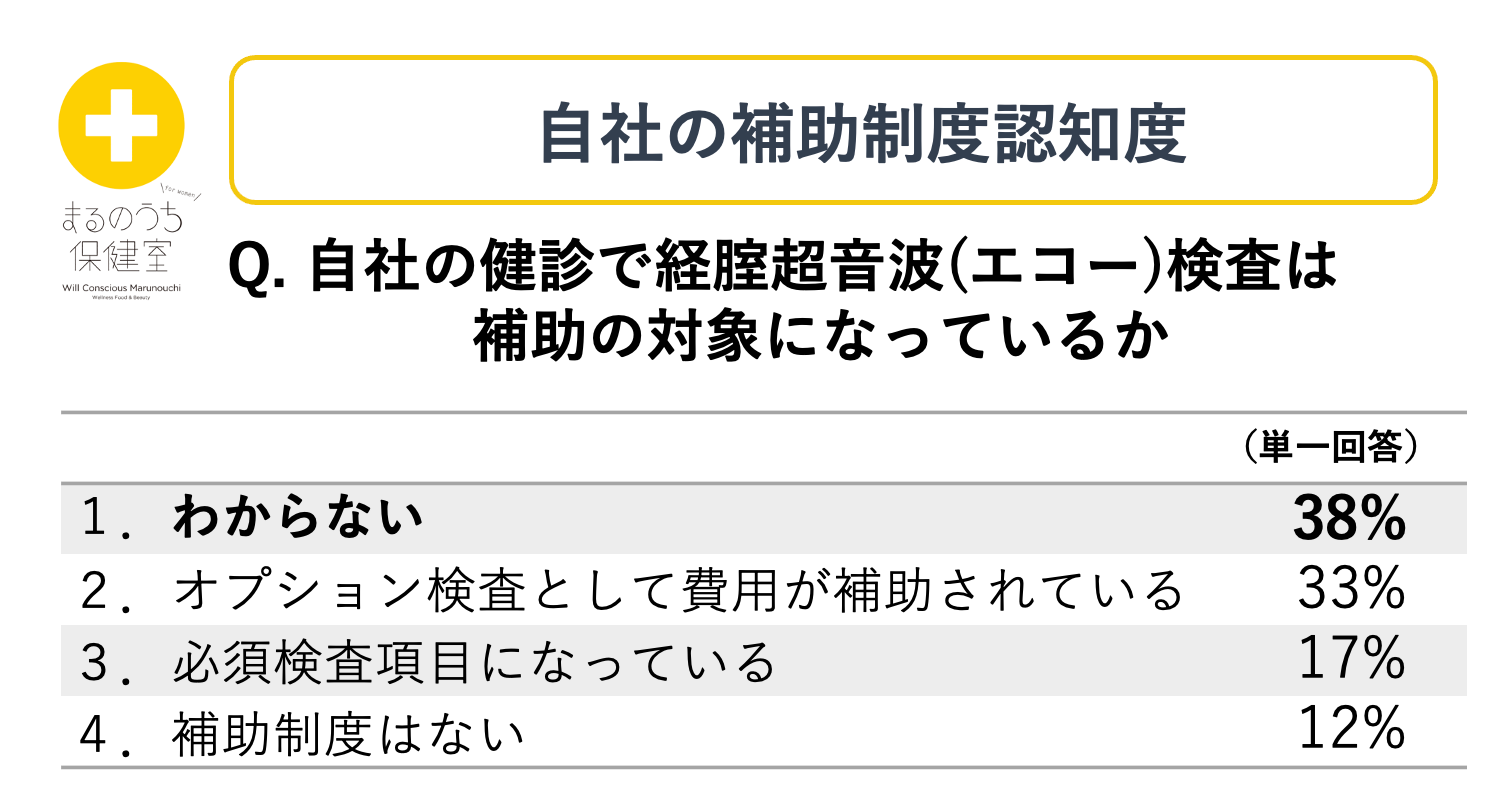 女性特有の疾患は経腟エコー検査受診で発見されるものも多く、その受診経験が71%である一方で、自社の検診で経腟エコー検査が企業補助の対象になっているかを知らない人は38%にも昇った。生理痛などの原因となりうる疾患もスクリーニングできる経腟エコー検査の認知や補助制度の理解促進は、全体的な共通課題と言える。