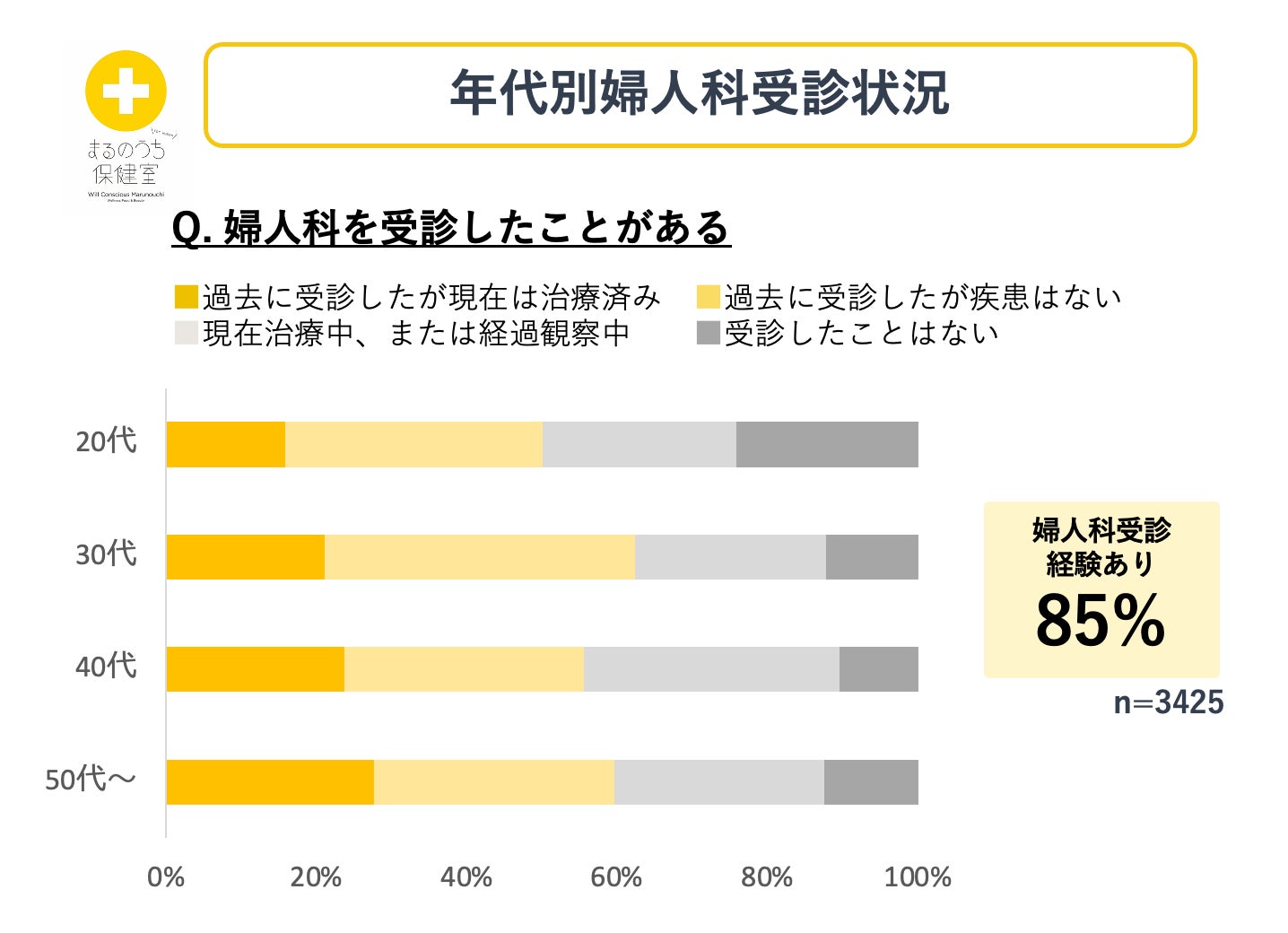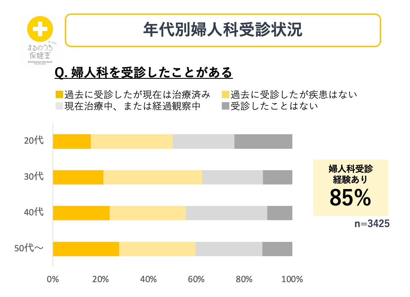年代別の婦人科受診状況では、受診経験ありが全体で85%に。また、半数が婦人科での疾患の診断・治療の経験があると回答。女性特有の症状がある自覚・リテラシーも高い傾向の一方で、対処までしている方は3割程度と人によって行動に差がある結果に。