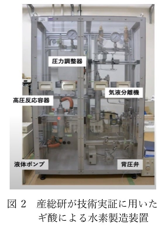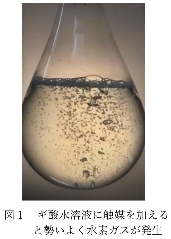 産総研ではこれまで、ギ酸からの高圧水素製造技術と社会実装に向けた研究が進められ、ギ酸水溶液と触媒を反応させ高圧水素を生成する技術実証がなされてきました。